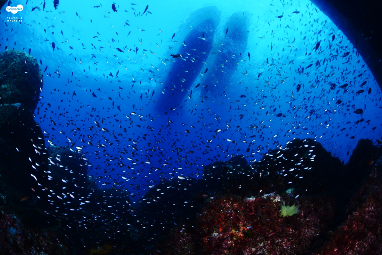 자리돔 치어들이 군락을 이루고 수면으로 2척의 다이빙보트 실루엣이 보인다