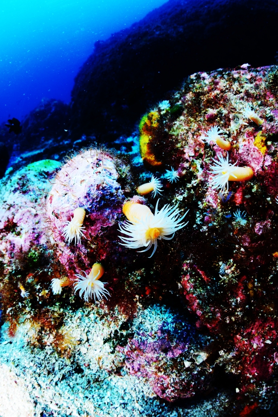 두번째 다이빙은 왕돌초의 남쪽에 있는 맞짬에서 진행하였다. 가장 남쪽에서 입수하였는데 깊은 수심은 어떤지 보고 싶어서 수심 25m 정도까지 남쪽으로 내려가 보았다. 깊은 수심에서는 울릉도에서 주로 보았던 오렌지색 말미잘 군락들이 보이기도 했고, 수온이 좀 낮아서 그런지 돌기해삼도 관찰되었다. 감태 숲은 사라졌어도 소라들이 바위 사이에 몸을 숨기고 있었고, 멍게들도 어두운 색의 실같은 해조류를 뒤집어쓴 채 몸을 숨기고 있었다. 과도한 남획에 살아남기 위한 적응 양상이 아닐까 하는 생각이 들었다. 그럼에도 자리돔은 엄청난 무리를 이루며 군무를 추고 있었다. 혼자서 돌아다니는 방어/부시리의 모습도 보였고, 수심이 얕은 봉우리들로 둘러싸인 분지에는 돌돔과 벵에돔들이 무리지어 있었다. 수온은 26℃~29℃를 보여주었다. 아쉬운 왕돌초 다이빙을 마치고 상승해야 했다.