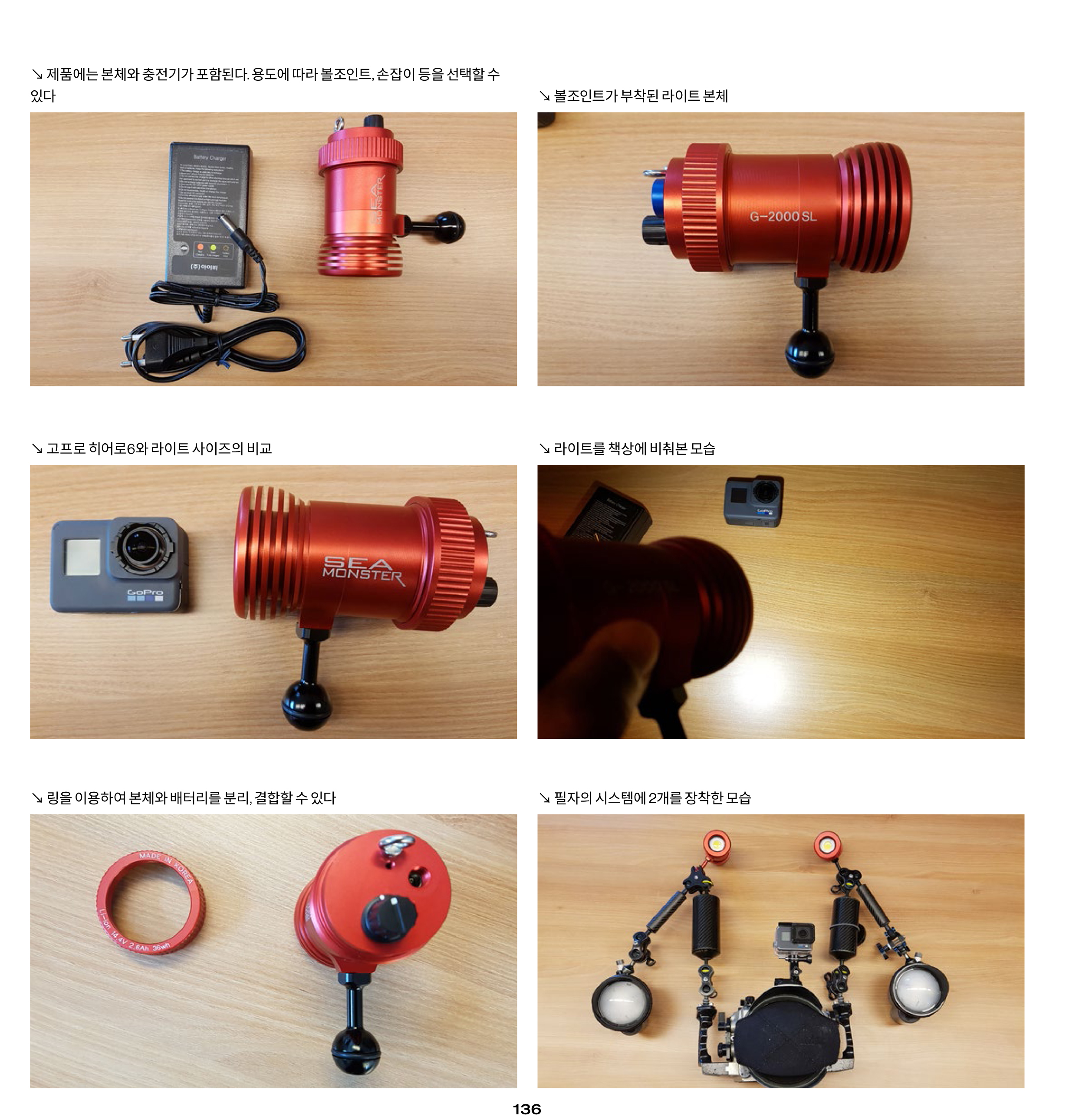사실 리뷰 기사를 작성할 때까지만 해도 라이트를 하나만 장착하여 촬영하였다. 고프로 촬영은 보조적인 것이라 생각했기 때문이었다. 하지만 라이팅을 한 동영상들을 확인하면서 싱글라이팅보다는 더블라이팅이 더 나을 것이라는 판단을 하게 되었다. 덕분에 동영상 비중이 더 커지게 된 것이다.
