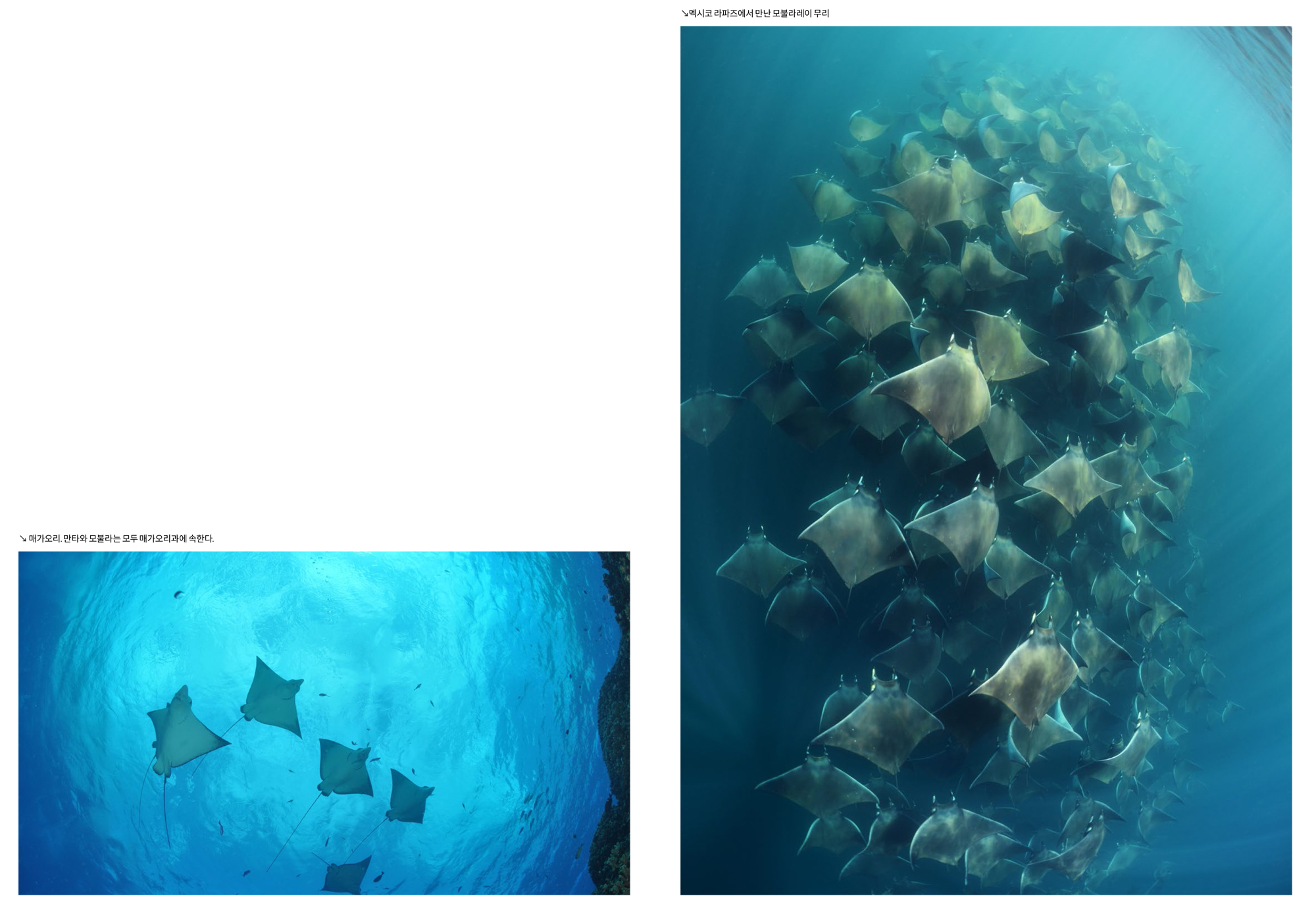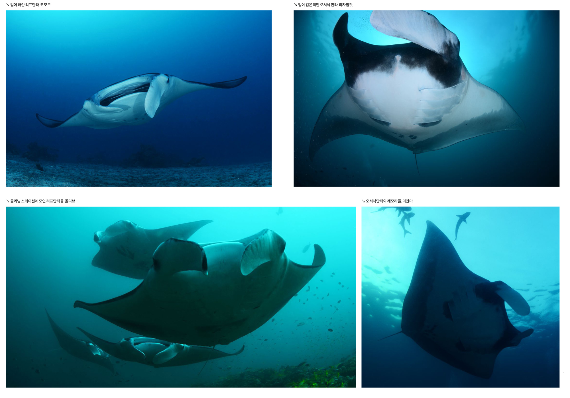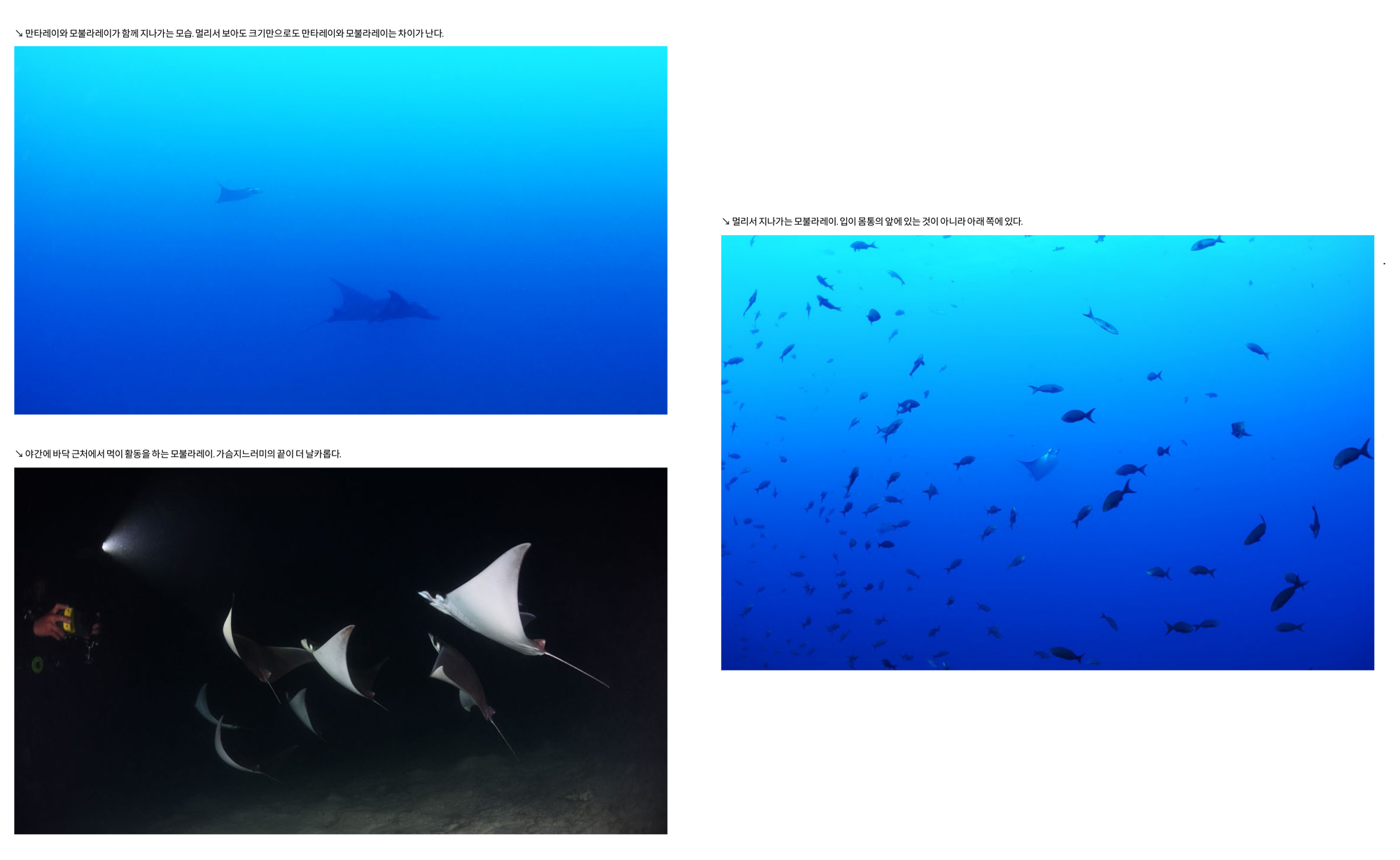 그런데 다이버들 중에는 비슷하게 생긴 모불라레이와 만타레이의 차이점을 잘 모르는 경우가 있다. 또한 만타레이 중에서도 리프 만타레이와 오셔닉 만타레이를 구분하는 것도 쉽지 않다. 이번 기회에 모불라레이와 만타레이의 차이점은 물론 만타레이 중에서 리프 만타와 오셔닉 만타의 구별법까지 한번 배워보자.
