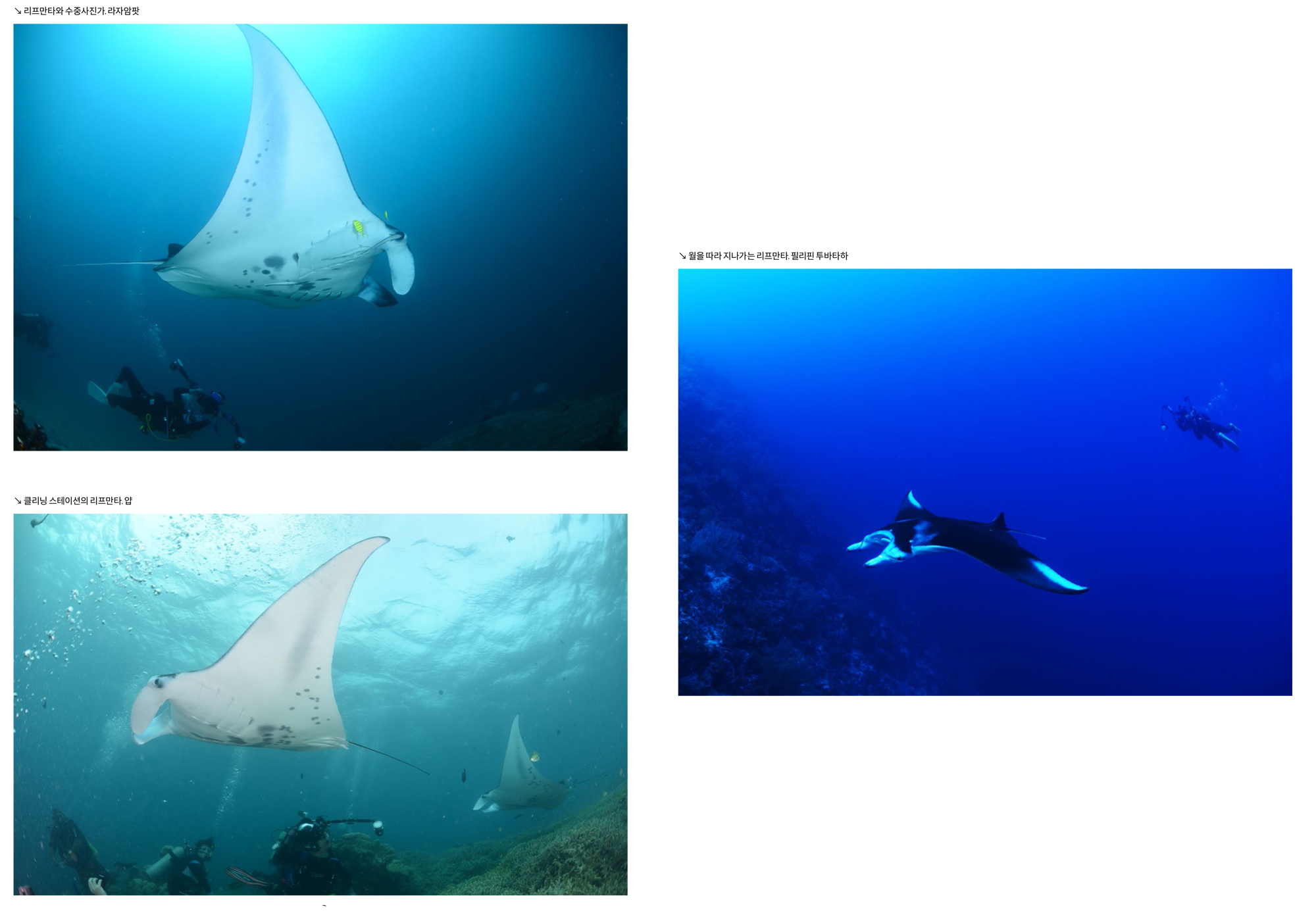 다이버들이 수중에서 가장 보고 싶어하는 물고기 중의 하나를 꼽자면 아마도 만타레이 Manta ray가 상위권에 속할 것이다. 우아한 날개짓으로 리프 위를 돌아다니는 만타레이는 다이버라면 누구나 좋아하는 물고기이기 때문이다. 리프의 클리닝 스테이션을 찾아와 선회하거나, 하버링하며 청소고기들의 서비스를 받고 있는 만타레이를 보고 있으면 왠지 뿌듯하게 가슴이 벅차오르는 느낌을 받을 때가 있다. 멸종위기종으로 만타레이를 볼 수 있는 곳이 그렇게 많지 않고, 또 볼 수 있는 곳이라 해도 매번 만날 수 있는 것이 아니어서 매우 귀한 순간이기 때문이다.