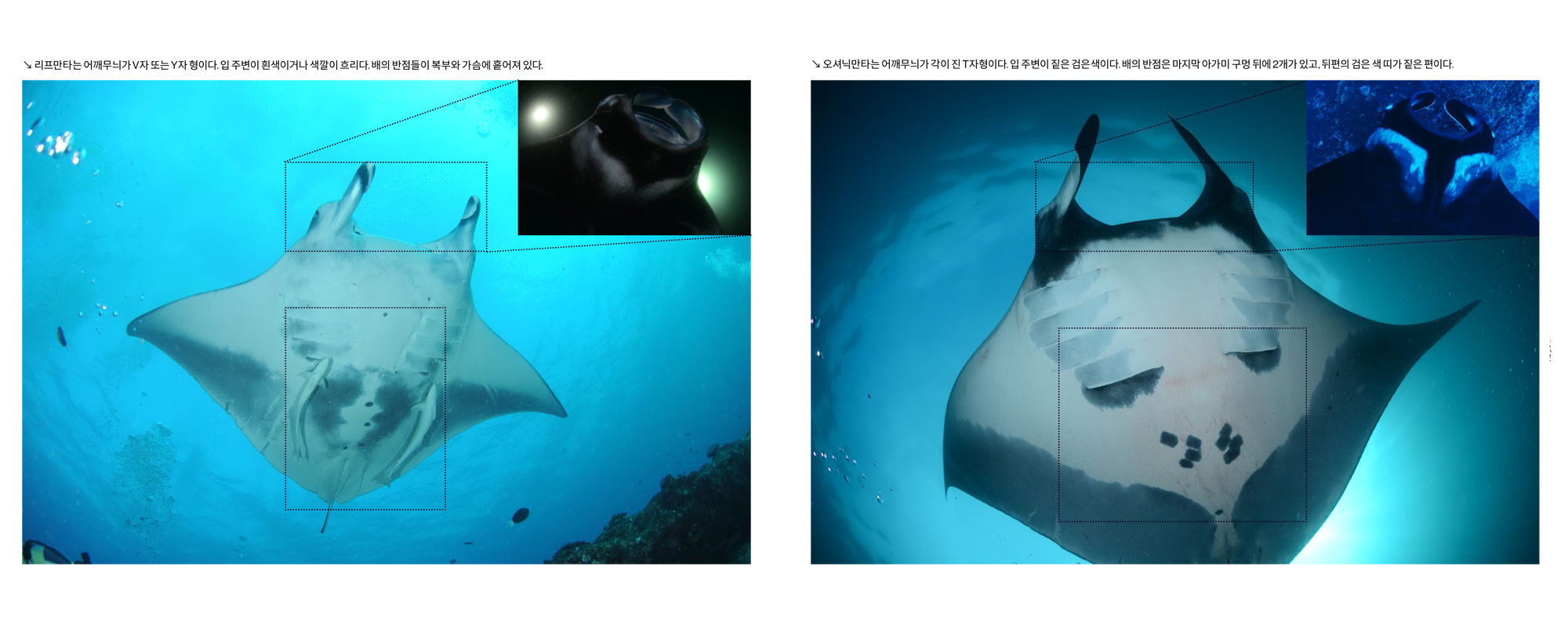 리프 만타와 오셔닉 만타의 차이우리가 만타라고 부르는 종에는 리프 만타 Mobula alfredi와 오셔닉 만타 Mobula birostris 두 종이 있다. 리프 만타는 최대 5.5m까지 자라는 반면에 오셔닉 만타는 최대 7m까지 자라기 때문에 자이언트 만타라고도 부른다. 하지만 최대 크기가 다를 뿐 두 종 모두 크기가 매우 크기 때문에 크기만으로 구분하기에는 변별력이 없다. 그래서 이 둘의 차이를 보다 확실하게 알아볼 수 있는 특징들을 찾아보았다.
