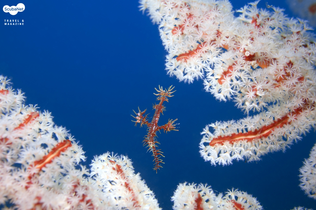 푸른색 배경과 피사체의 흰색과 붉은 색이 잘 어우러져 색감의 화려함이 표현된다. 살아 있는 산호 폴립에 은폐하고 있는 것이 물 공간에 노출되는 타이밍을 노렸다.