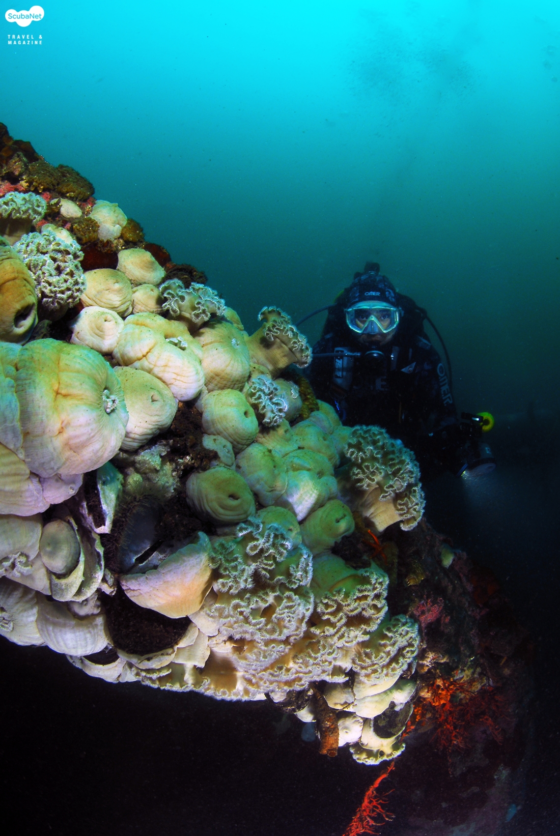 어초의 섬유세닐말미잘과 다이버