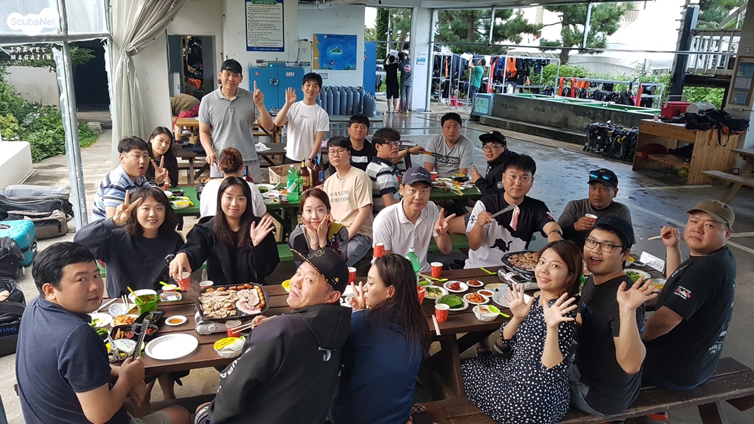 다이빙을 마치고 고기를 구워 파티를 즐기는 회원들
