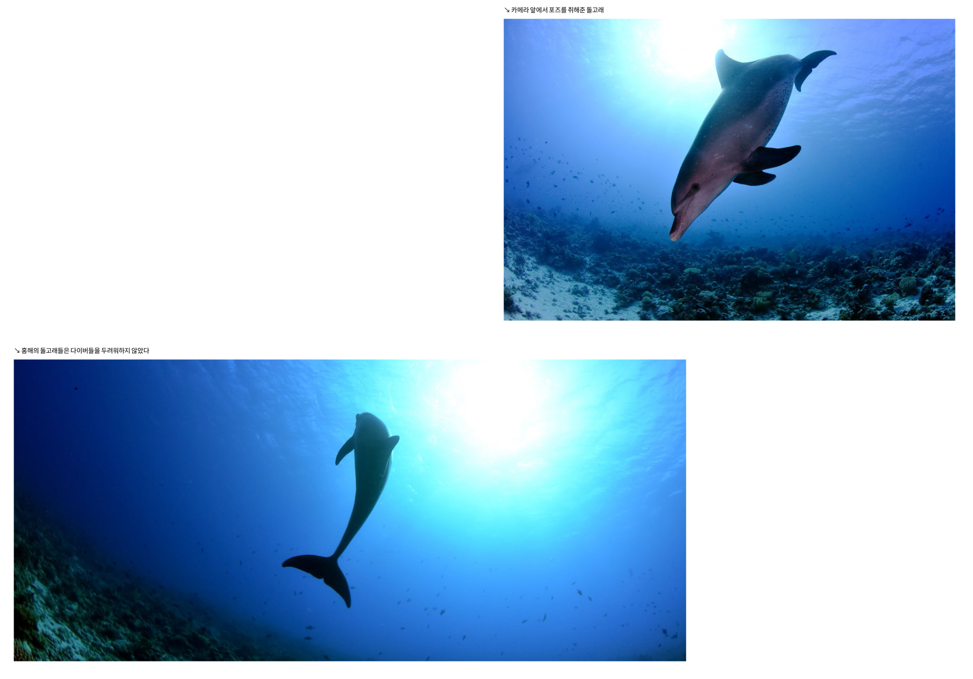 돌핀하우스는 수심이 깊지 않고 돌고래가 지나다니는 길목이기 돌고래의 출현이 가장 잦은 곳이라 포인트 이름도 돌핀하우스였다. 하지만 체크 다이빙을 종료하기 전까지 돌고래를 보진 못했다. 2, 3회 다이빙은 다른 포인트로 이동을 하였고, 홍해 첫 날의 다이빙은 끝이 났다. 대부분의 어그레서가 그러하듯 전문 요리사가 준비해준 만찬에 맥주와 와인을 곁들이며 하루를 마감했다.
