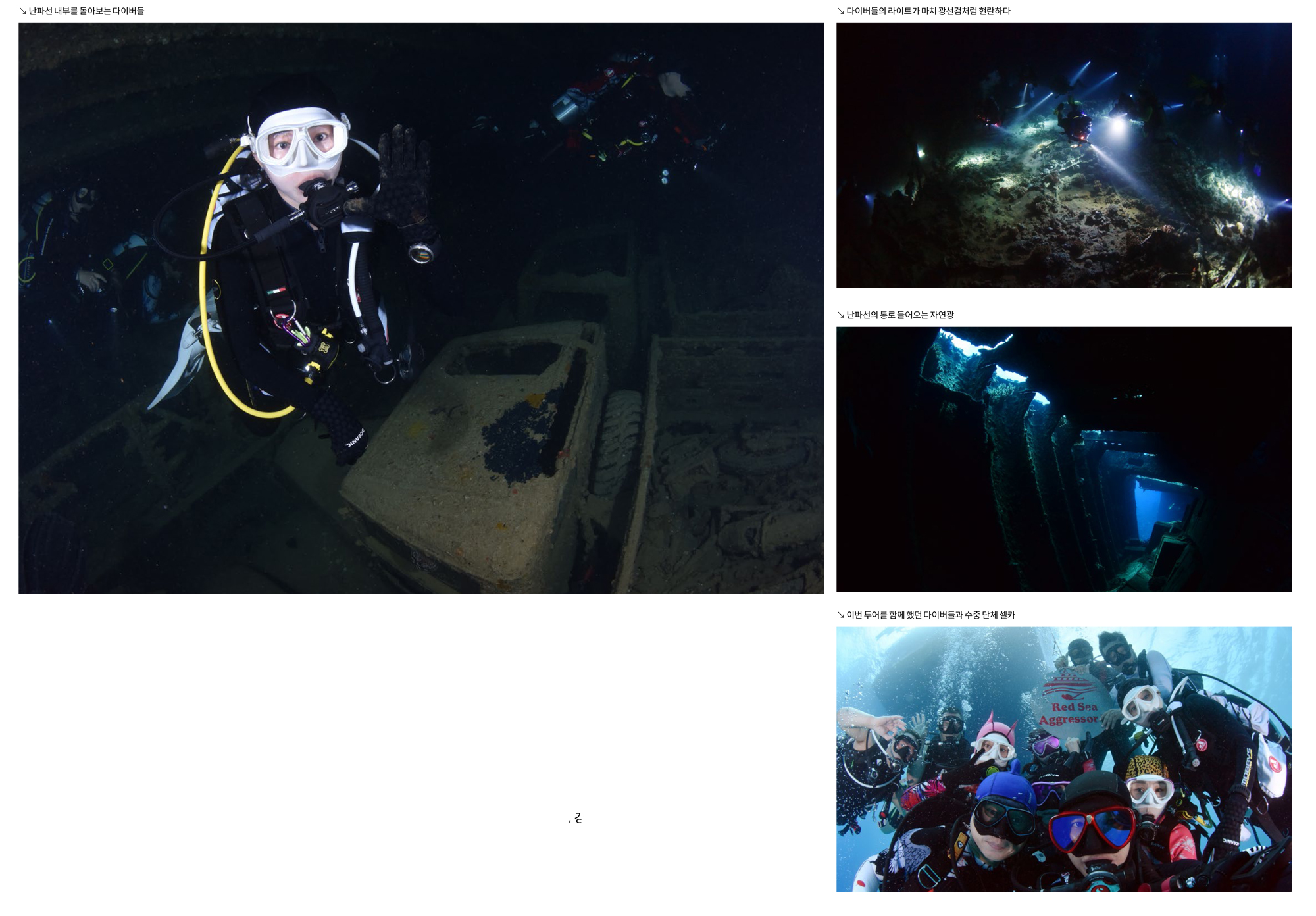 홍해에는 다양한 포인트들이 존재한다. 특히 북쪽 코스에는 크고 작은 난파선들이 있는데 우리나라에서 소형 난파선, 혹은 그 잔해만 보다가 70~80% 이상 원형을 유지하고 있는 초대형 난파선에서 선실로 진입하고 외부를 관찰하는 것이 매우 흥미로웠다. 홍해의 돌고래는 난파선 포인트에서 수 차례 발견되었다. 이번에 전체 23회의 다이빙 중에서 15회가 난파선 다이빙이었는데 대부분 돌고래들과 만났으며, 5분 이상은 다이버들 주위에서 같이 헤엄쳤던 기억이 남는다.