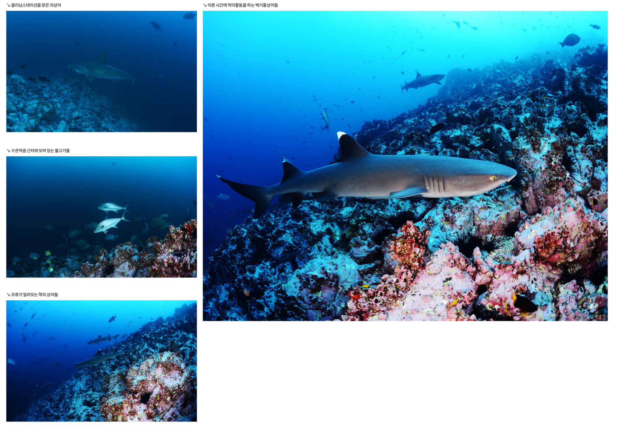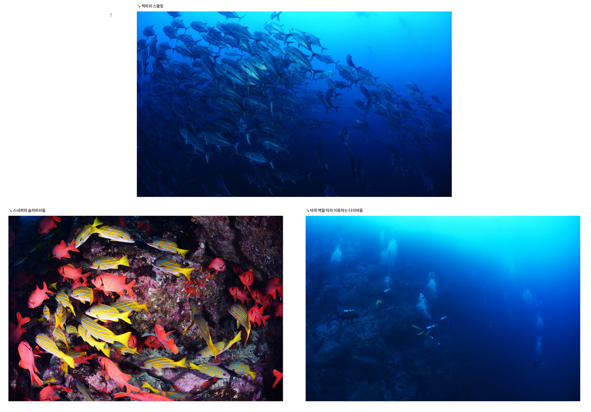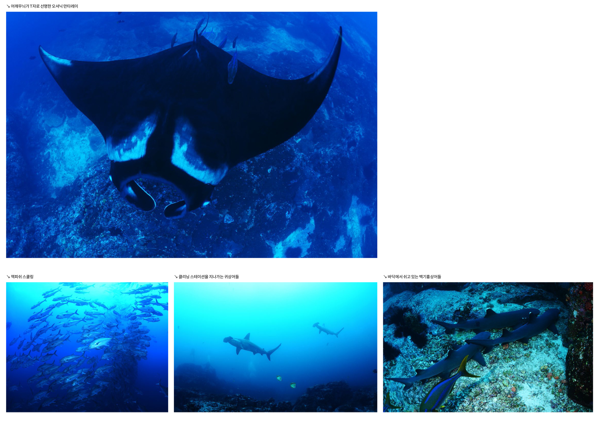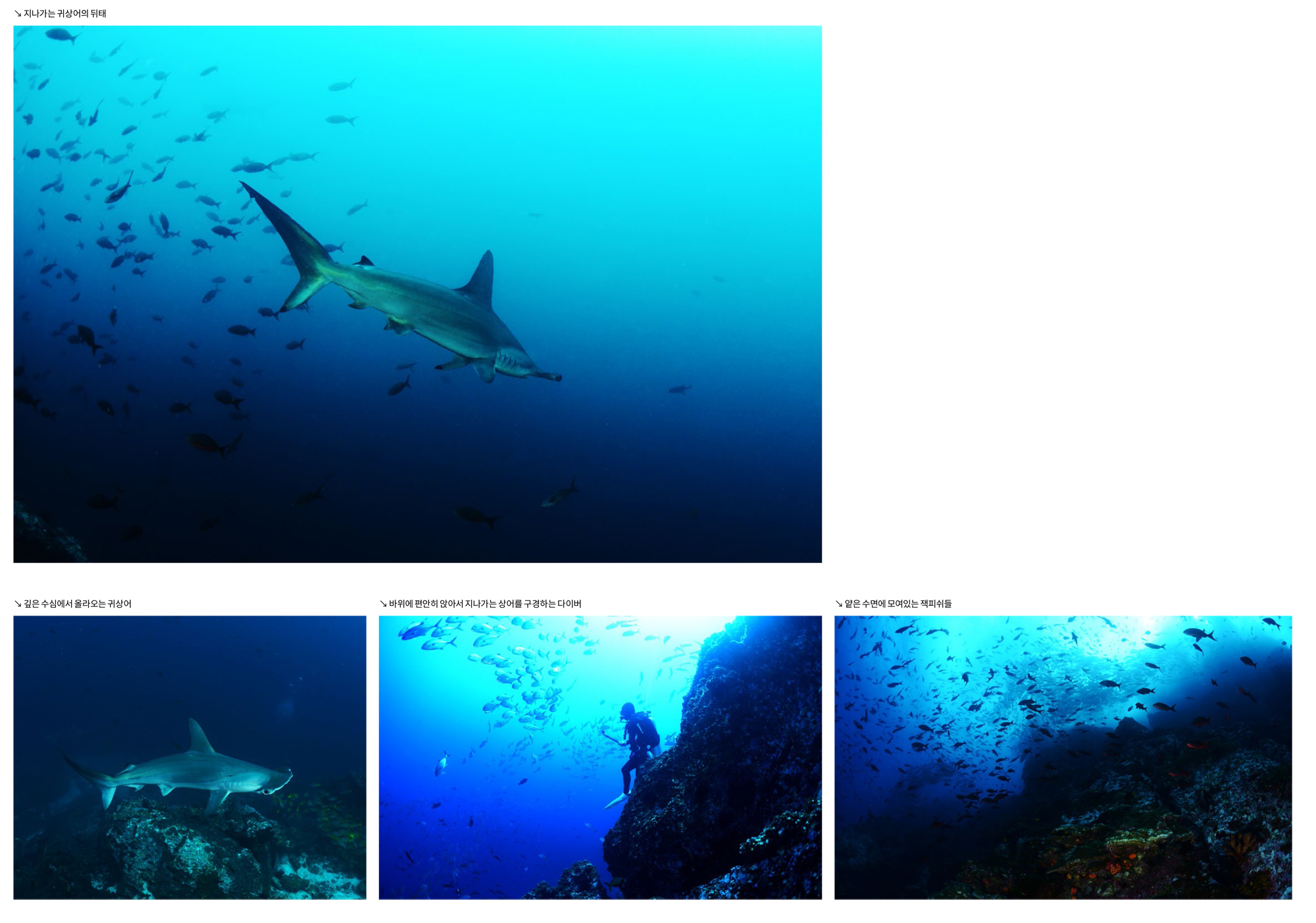 가까이 접근하는 귀상어와 멀리 무리지어 지나가는 귀상어들을 모두 구경하고 촬영할 수 있다. 이곳에서는 귀상어들 때문에 다른 것들은 거의 눈에 들어오지 않는데 마블레이와 백기흉상어들도 매우 많았고, 크레바스 속으로는 닭새우들이 여러 마리 겹쳐서 자리 잡고 있었다.