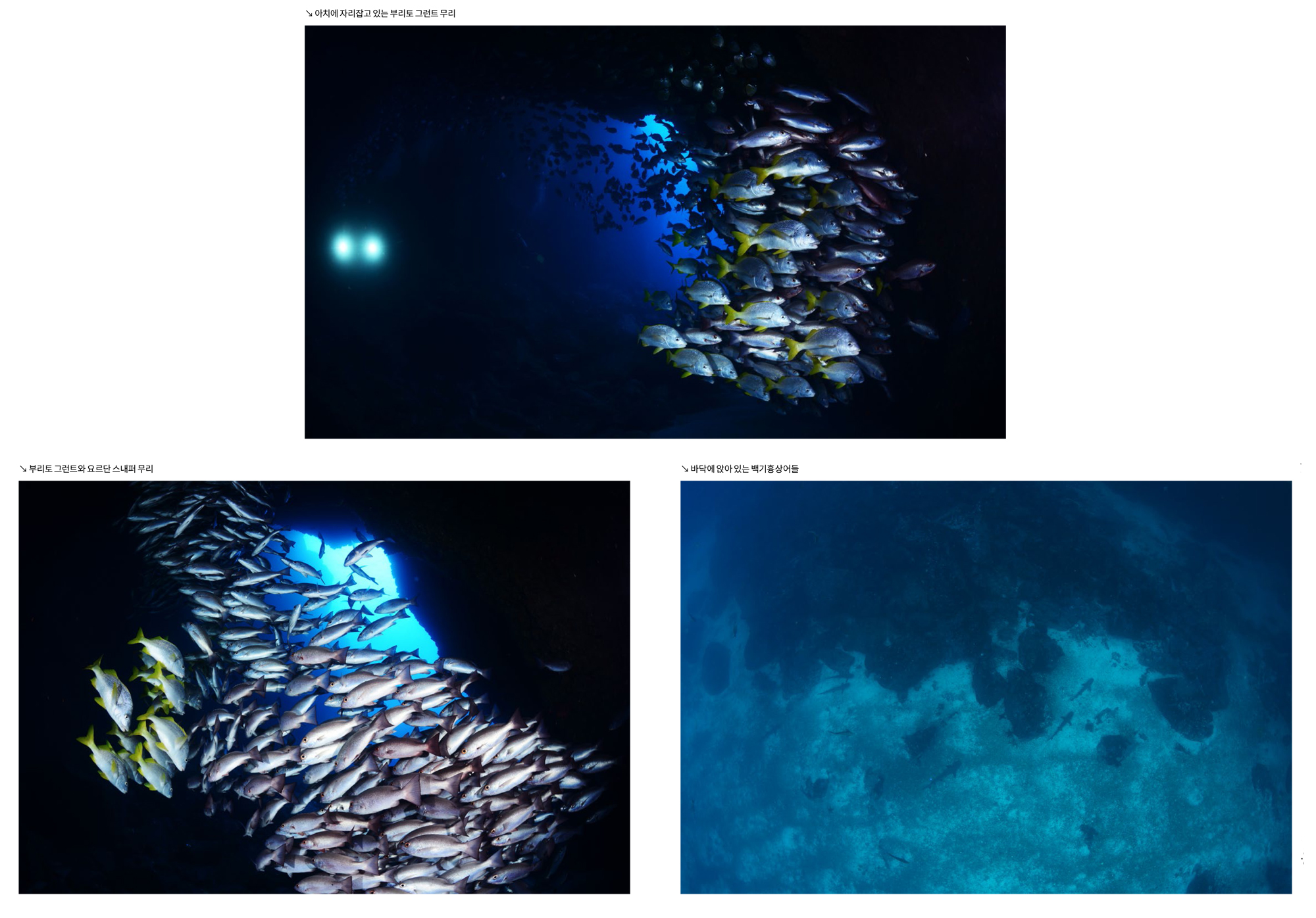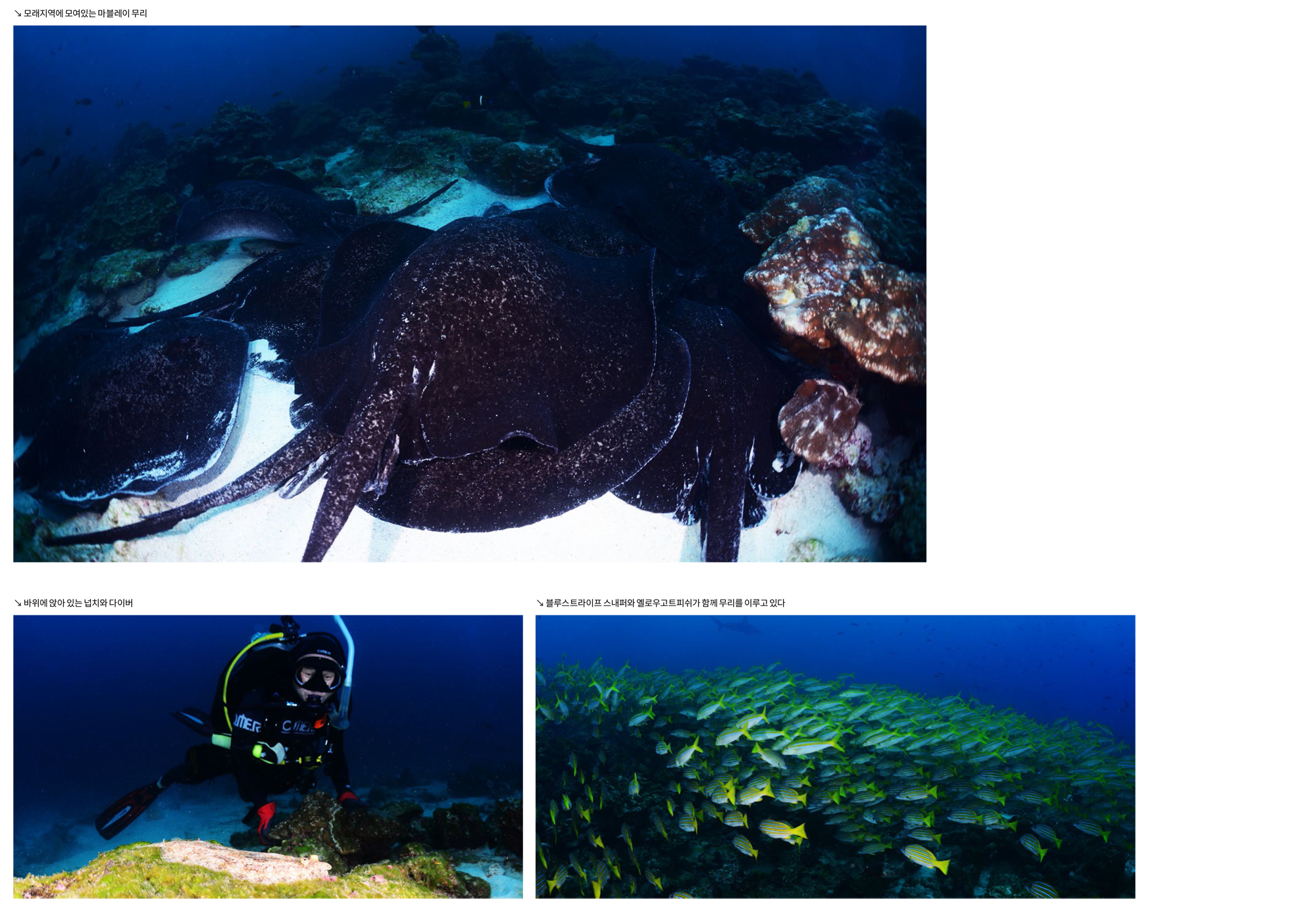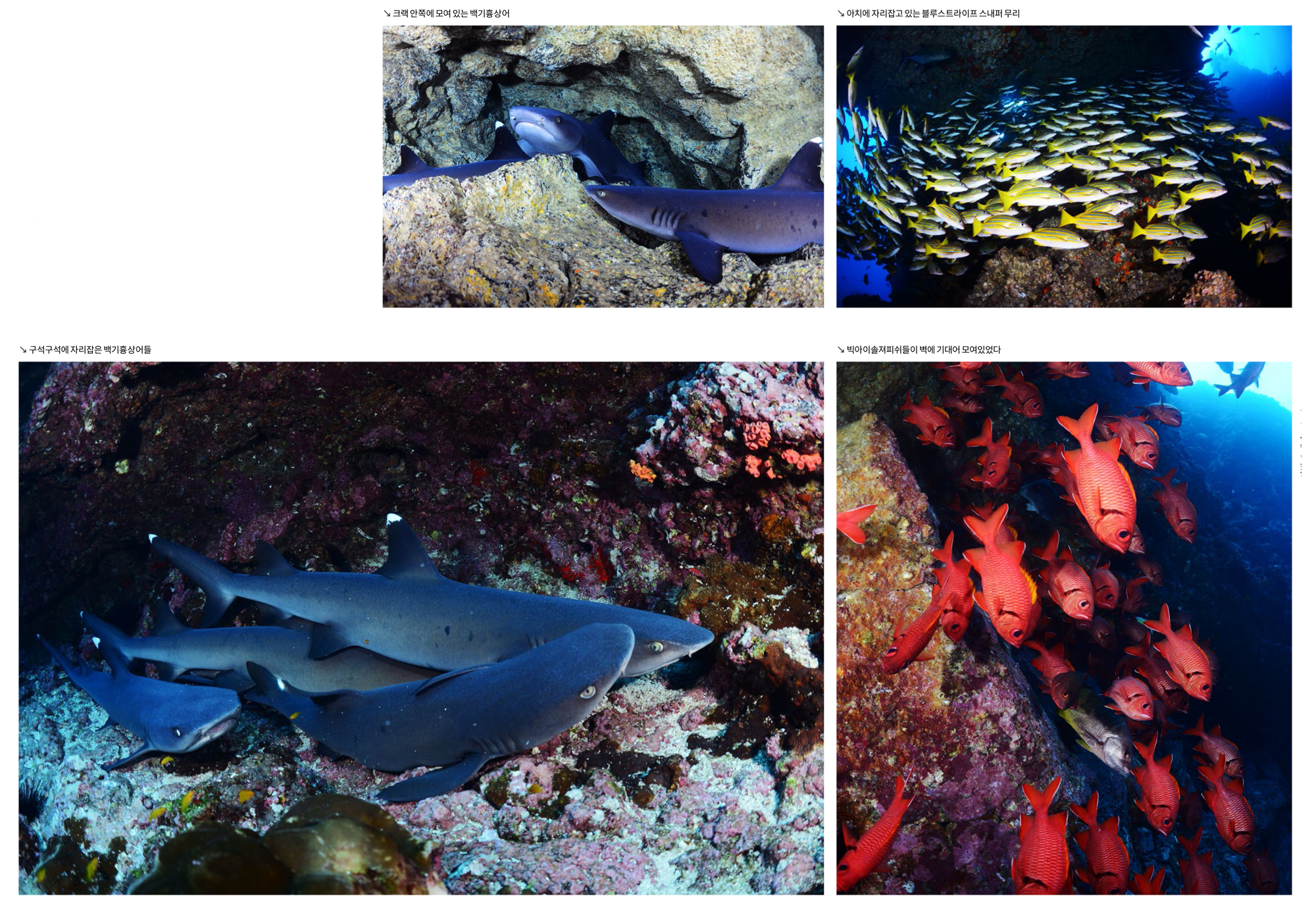가까이 접근하는 귀상어와 멀리 무리지어 지나가는 귀상어들을 모두 구경하고 촬영할 수 있다. 이곳에서는 귀상어들 때문에 다른 것들은 거의 눈에 들어오지 않는데 마블레이와 백기흉상어들도 매우 많았고, 크레바스 속으로는 닭새우들이 여러 마리 겹쳐서 자리 잡고 있었다.