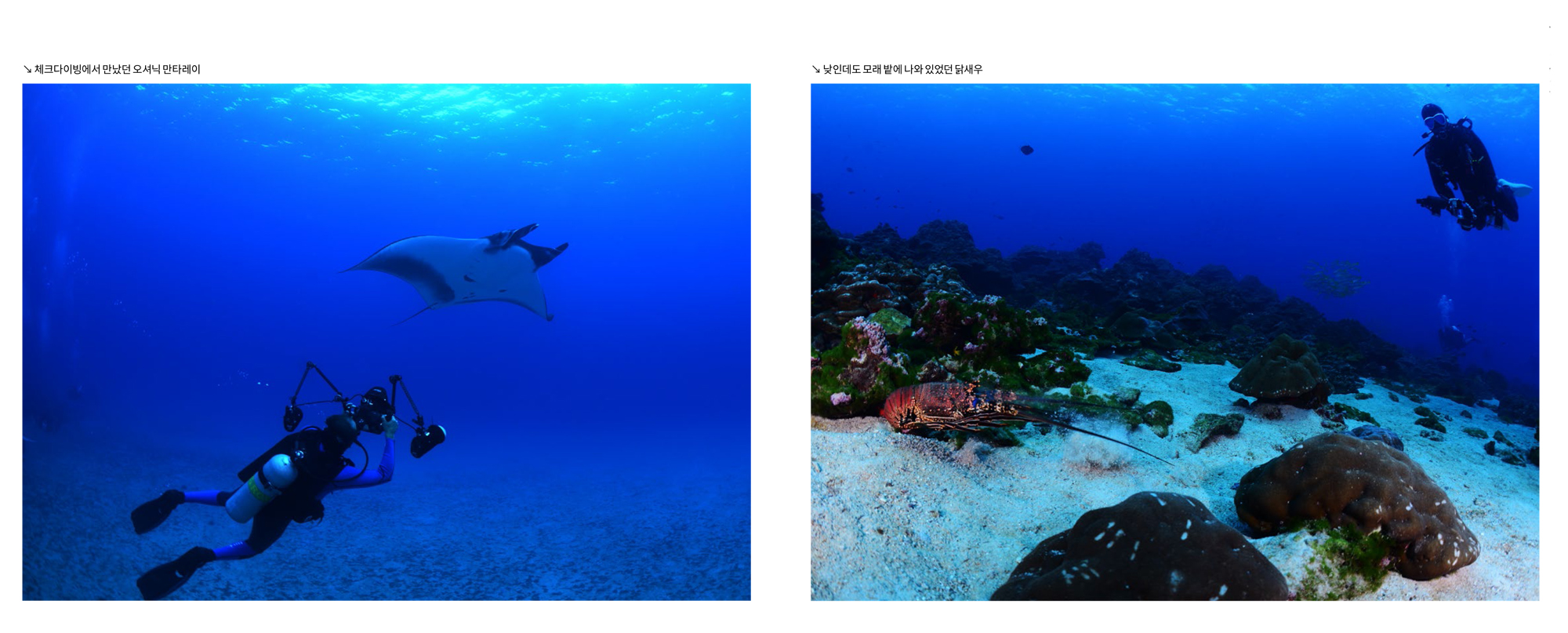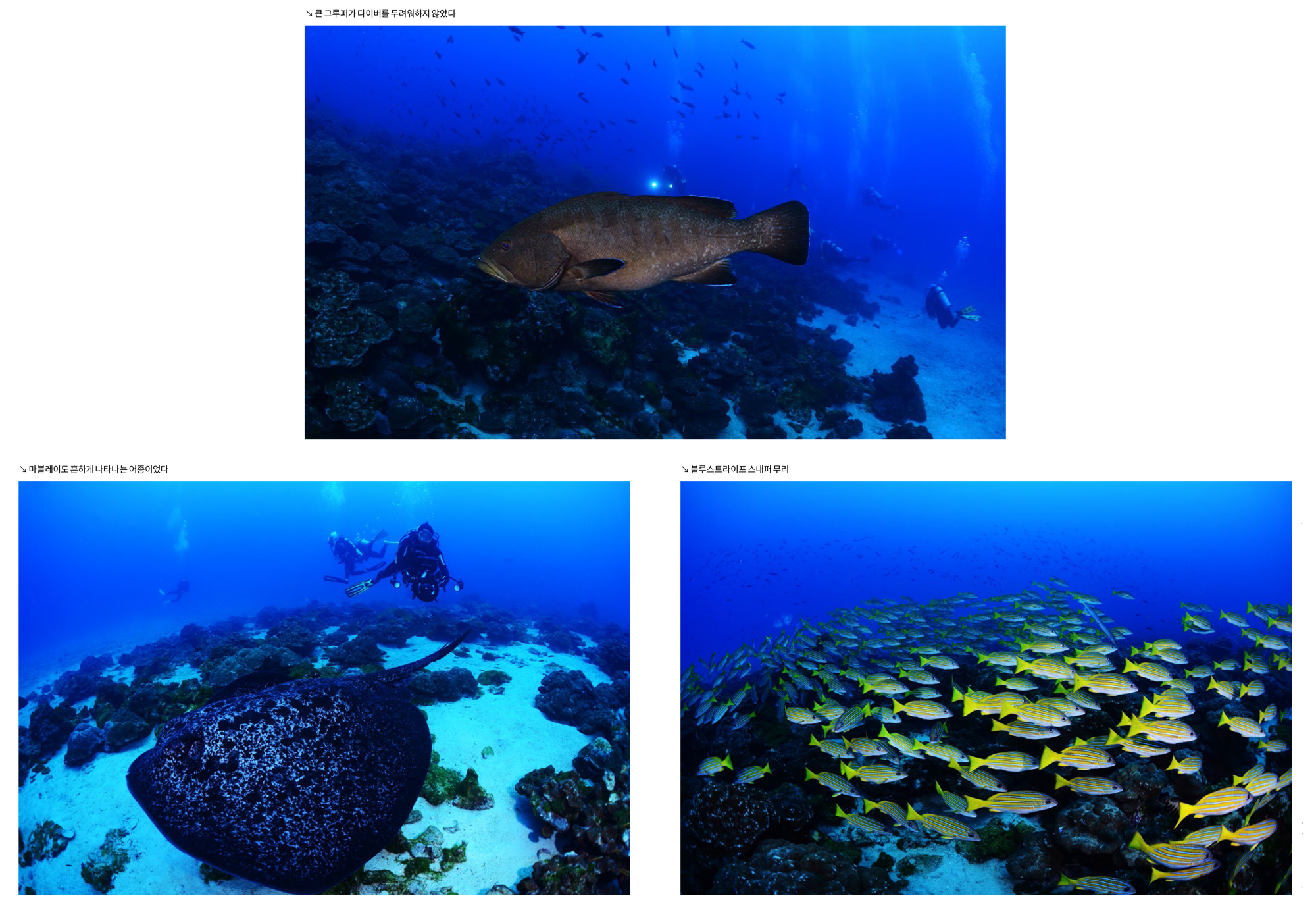클리닝 스테이션에는 나비고기와 놀래기, 엔젤피쉬 등이 모여서 대물들이 상륙하기를 기다리고 있었다. 거대한 잭피쉬 스쿨링도 있었고, 대형 오셔닉 만타레이와 조우하기도 하였다. 몇 차례 돌아주어 멋진 사진과 영상을 남길 수 있는 기회를 주었다. 입수할 때는 부이라인을 잡고 하강하지만 상승할 때는 가이드나 버디와 함께 SMB를 이용하여 안전하게 자유상승하면 된다.