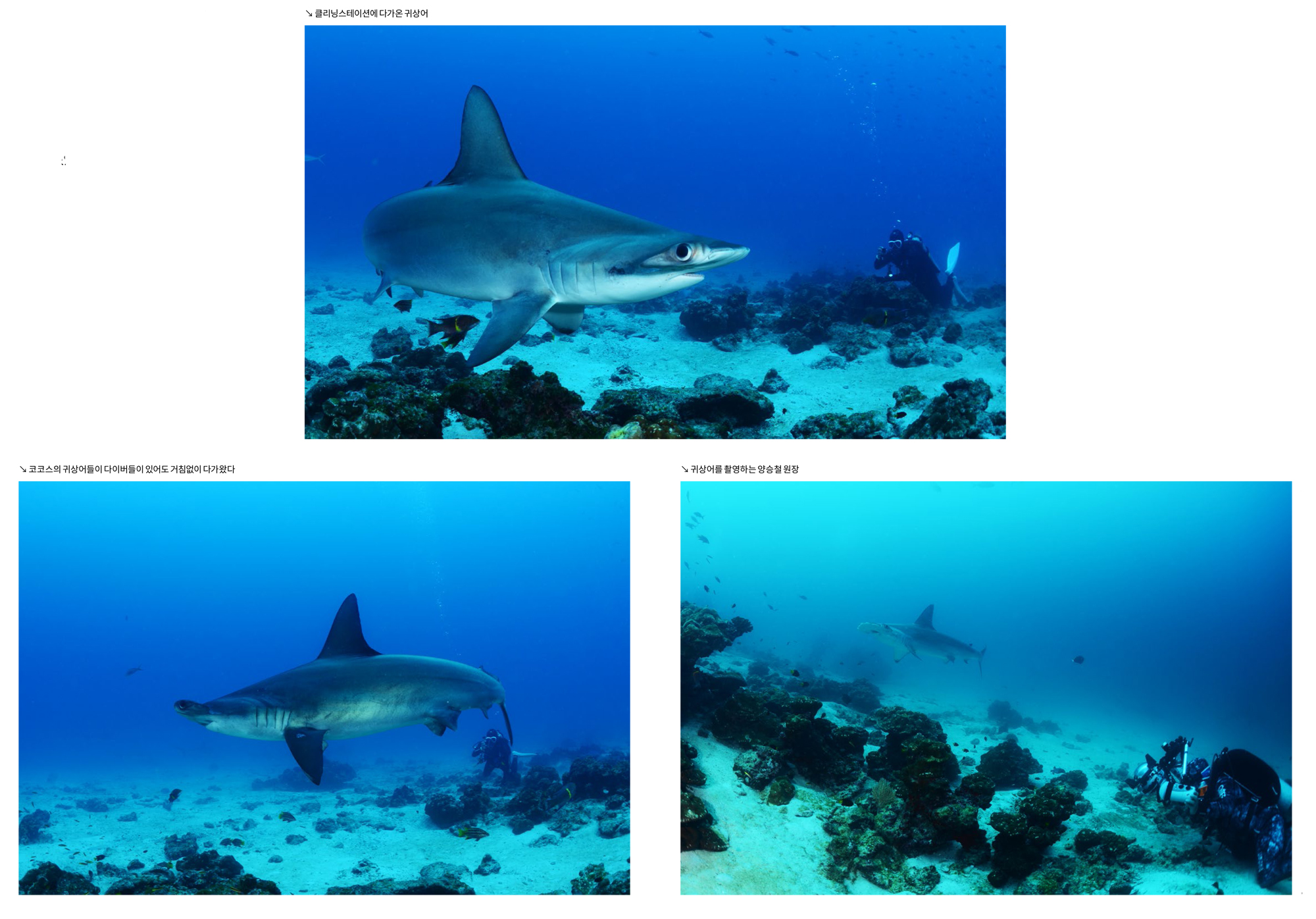 이번 투어에서 귀상어들을 가장 많이 볼 수 있는 포인트였다. 첫 다이빙에서는 시야가 흐렸지만 엄청나게 많은 귀상어들이 나타났기에 아쉬움이 많아 남았다. 기대했던 사진과 영상을 찍을 수 있는 곳이었지만 시야가 흐렸던 것이다. 그래서 이후로도 몇 번 더 다이빙을 했는데 시야는 맑아졌지만 첫 다이빙만큼 많은 귀상어들이 나타나지 않았다. 클리닝 스테이션으로는 깊은 곳에서 귀상어들이 월을 따라 올라와서 가깝게 접근하였다. 따라서 아래, 위로 모두 귀상어를 볼 수 있기에 시시각각 시선을 돌려야 했다.