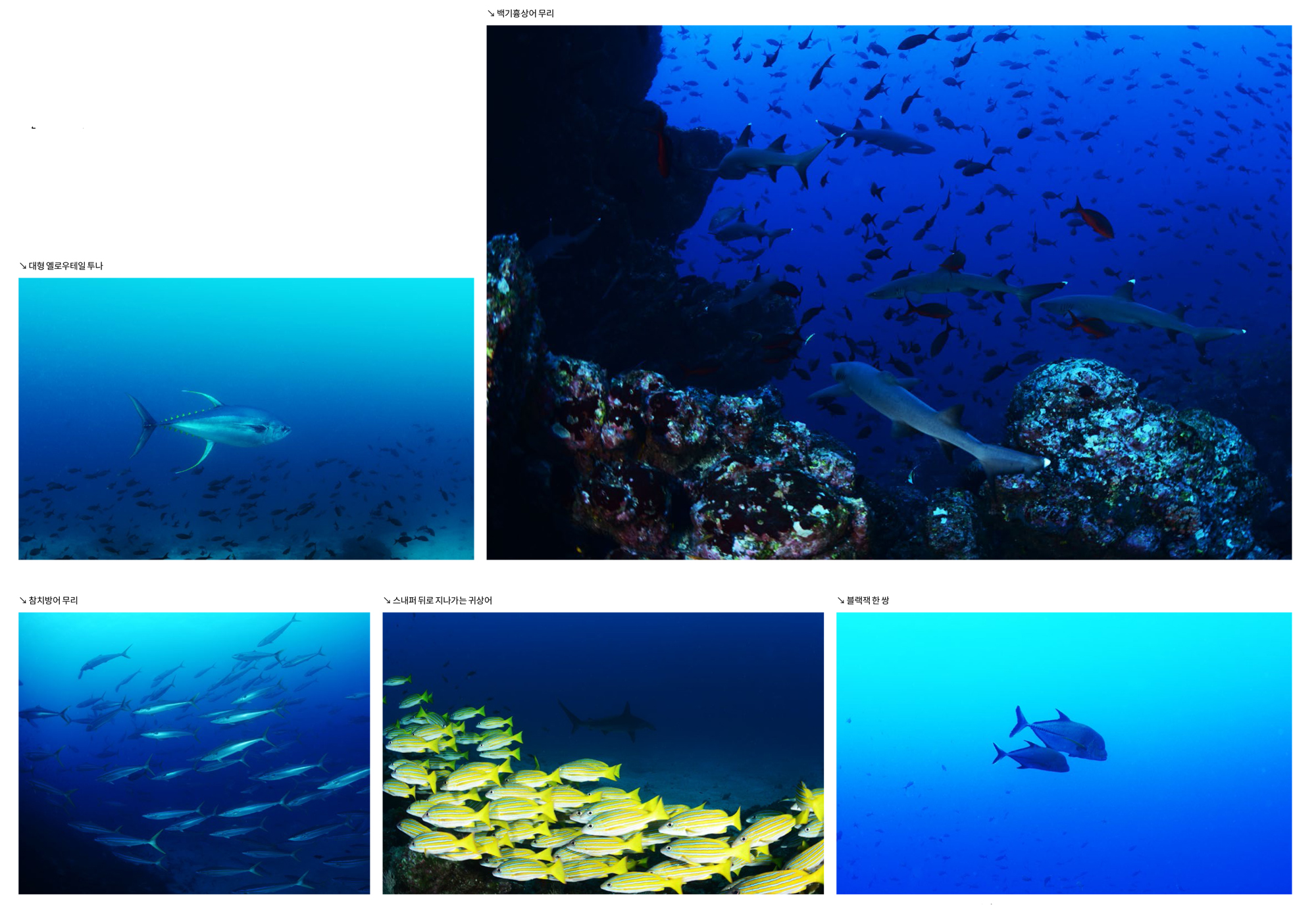 다이버들이 귀상어와 뱀상어 그리고 만타레이 등의 대물들에 관심을 갖느라 잭피쉬 스쿨링이나 블루스트라이프 스내퍼, 옐로우고트피쉬, 요르단 스내퍼 등의 무리에는 크게 관심을 표시하지 않았다. 그것만 해도 다른 곳이라면 다이버들이 흥분했겠지만 너무 흔하게 볼 수 있는 장면들이었다. 잭피쉬 스쿨링이나 스내퍼 무리 사이로 지나가는 백기흉상어 정도가 되어야 조금 관심을 가질 정도였다. 이 정도면 코코스의 가장 지루한 다이빙 조차도 다른 지역에서는 수준급의 다이빙이라고 할 수 있을 것이다.
