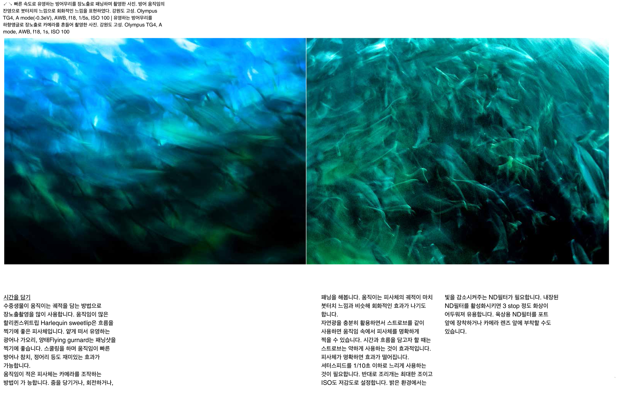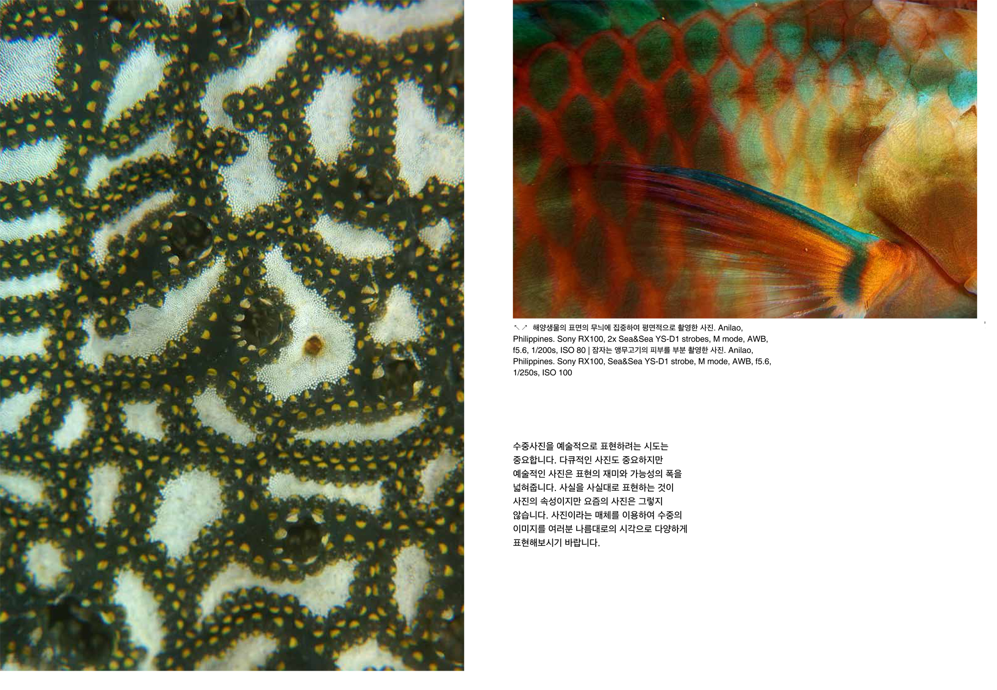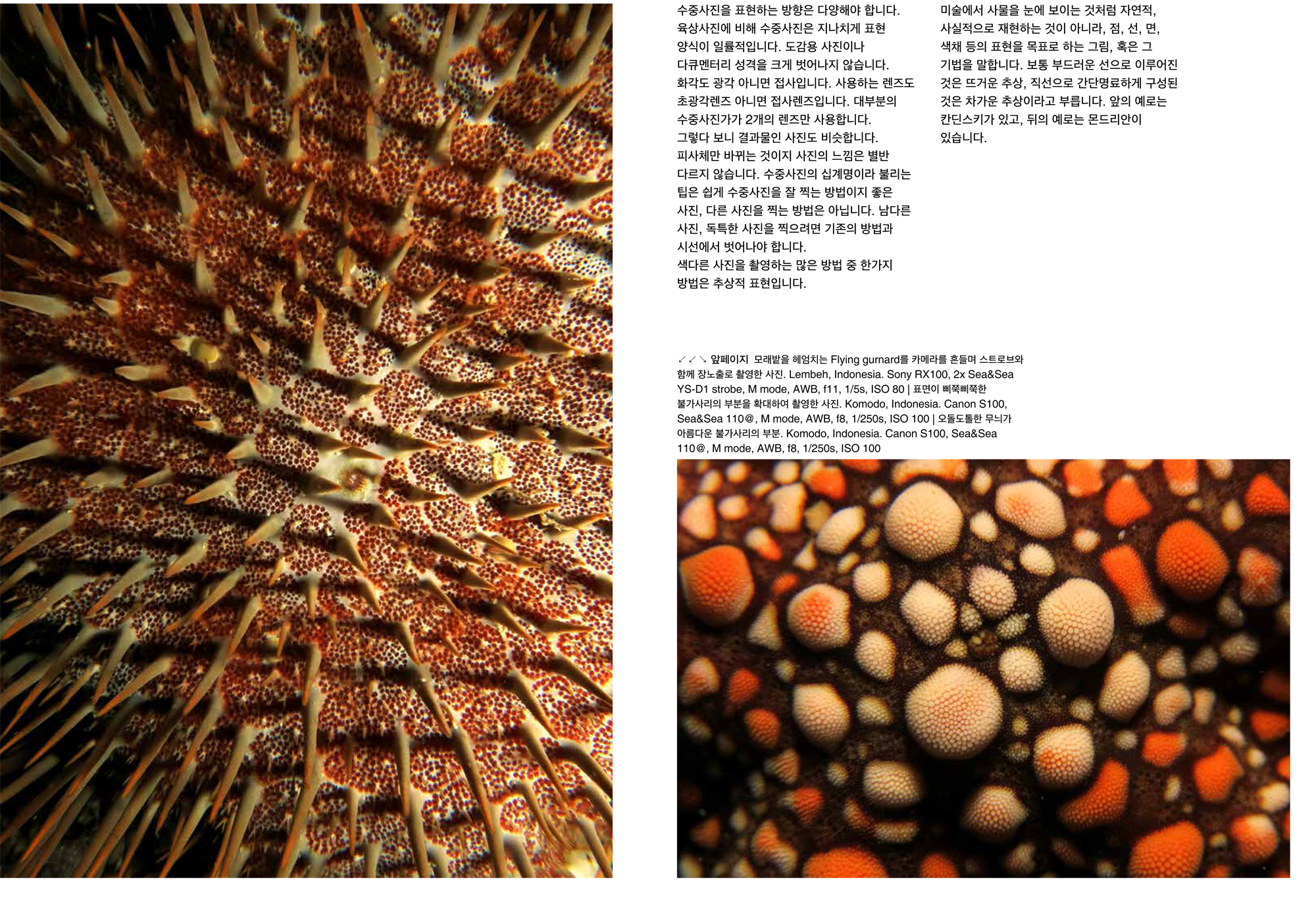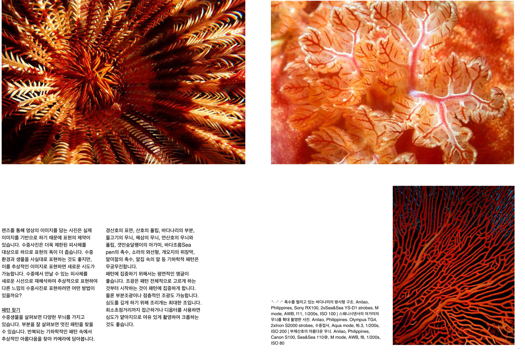 사진은 우리 주위의 피사체를 렌즈를 통해 표현하는 작업입니다. 수중사진도 수중의 풍경이나 생물의 모습을 사실적으로 표현하고 있습니다. 수중사진을 피사체의 구체적인 표현이 아니라 추상적인 이미지를 표현하면 어떨까요? 수중사진을 예술적인 표현으로 접근하는 하나의 방법으로 추상적 표현을 생각해봅니다.