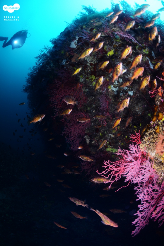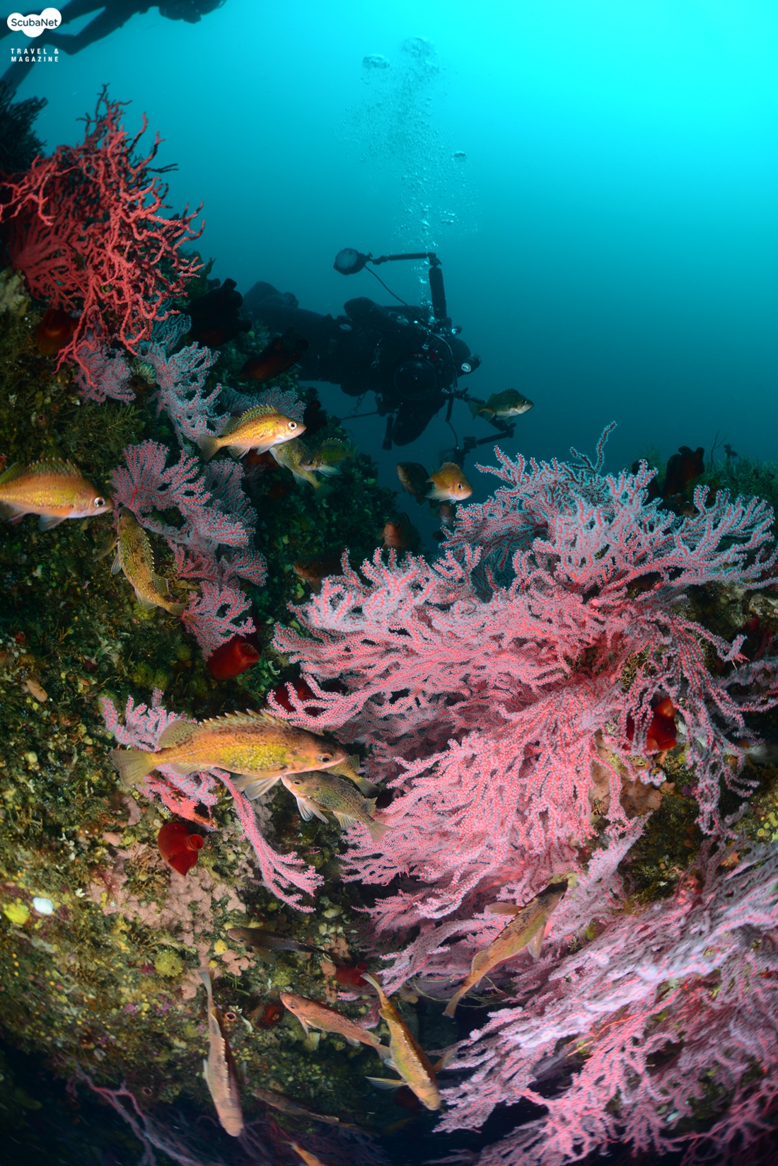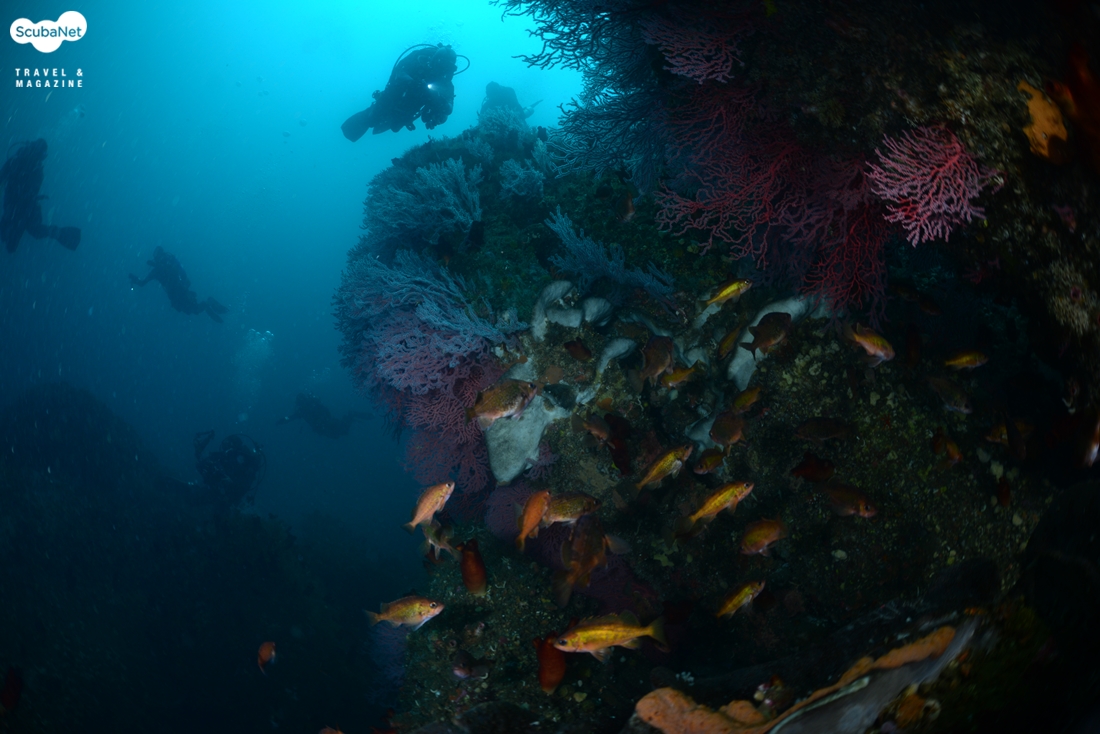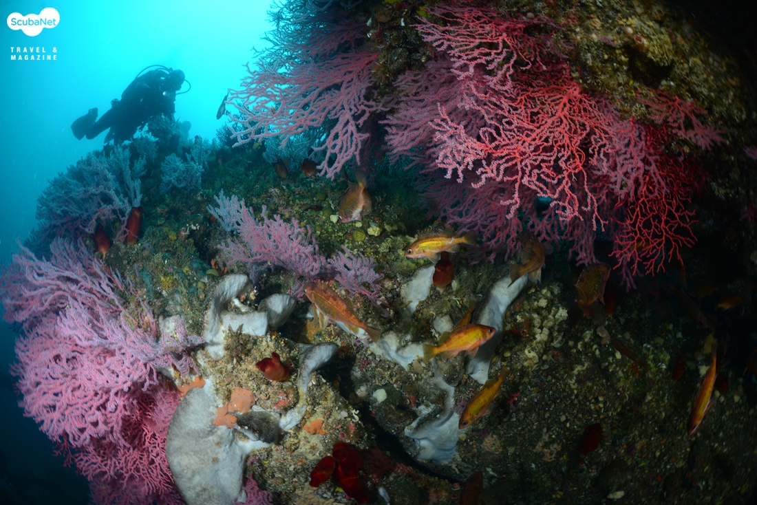 크랙 사이의 화려한 부채뿔산호 군락과 볼락들을 촬영하는 다이버