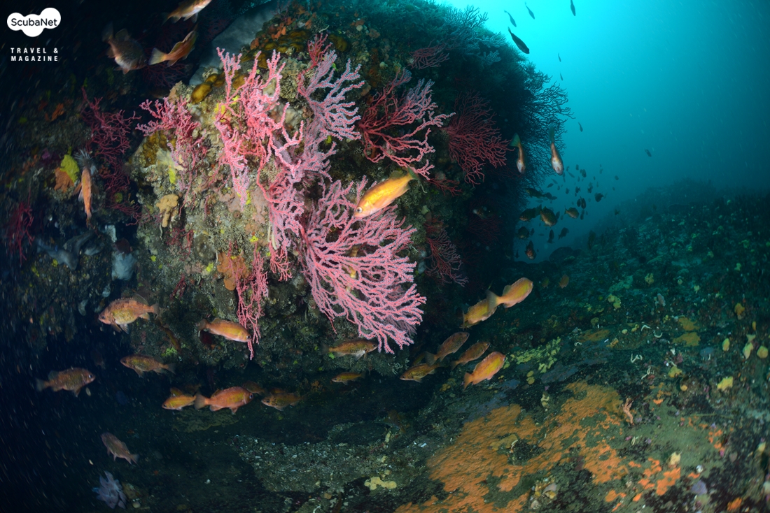 화려한 부채뿔산호 군락과 바위 아래 모여 있는 볼락들