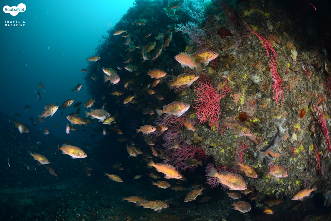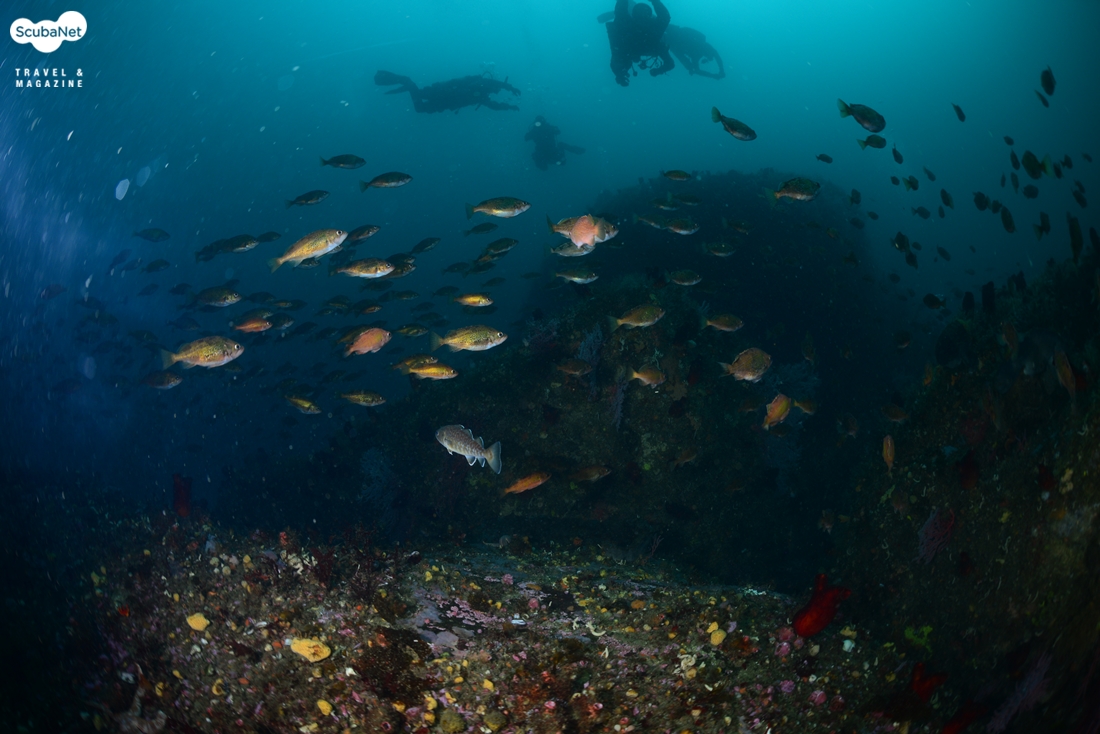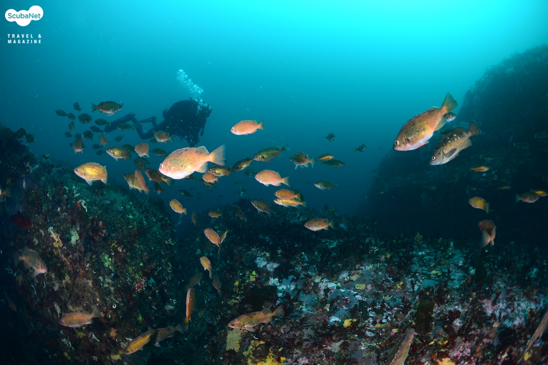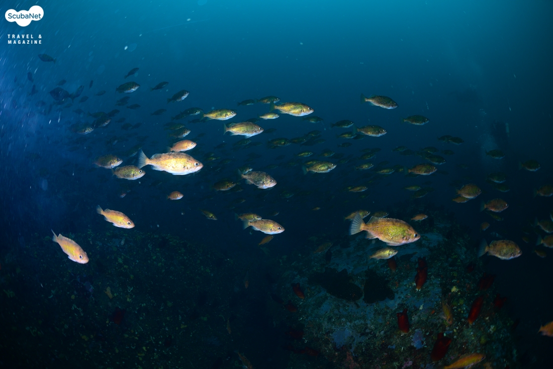 울릉도 포인트의 다이버들 아래로 무리지어 이동하는 볼락들. 대구도 한 마리 보인다