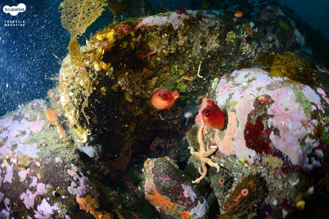 해양실습 포인트로 적당한 청간정 비치 볼락과 부채뿔산호가 좋은 아이별 포인트첫 다이빙은 아이별 포인트로 항하였다. 청간정스쿠버에서 새로 개발해서 벌써 다이버들에게 소개하고 있는 포인트이다. 수심이 비교적 깊은 곳이라 동해의 딥 다이빙 전문 가이드 이성호 트레이너가 안내하고, 딥 다이빙이 가능한 베테랑 다이버들만 동행했다. 수심 35m 바닥권에 24m 수준으로 암반 봉우리들이 올라있었다. 바위 봉우리의 사면을 따라 부채뿔산호 군락이 병풍처럼 펼쳐져 있었고, 덩치 큰 볼락들이 무리를 이루며 돌아다니고 있었다. 이성호 트레이너에 따르면 처음 개발했을 때는 라이트를 들이대도 볼락들이 움직이지 않았다고 하는데 일주일 사이에 벌써 다이버들이 많이 들어갔는지 라이트를 켜니 볼락들이 뒤로 물러났다. 촬영을 위해 어쩔 수 없이 쫓아다녀야 했다. 볼락들이 크기가 꽤 컸다. 34m 수심의 온도는 7℃, 수면 근처의 온도는 27℃로 높았다. 평균 수심 19m에 평균 수온은 19.4℃였다. 5mm 단면지 투피스에 베스트를 하나 추가했는데 다이빙 시작 15분 이후에 추위를 느꼈다. 동해의 수온이 전반적으로 높아져서 웻슈트 다이빙이 충분히 가능하다고 했지만 드라이슈트를 입는 것이 맞았다는 생각이 들었다.