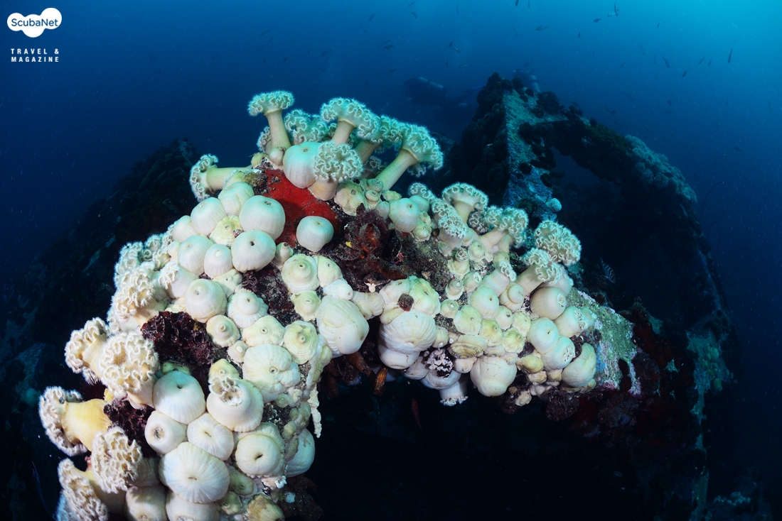 어초 상단에 자리한 흰색의 섬유세닐말미잘 군락