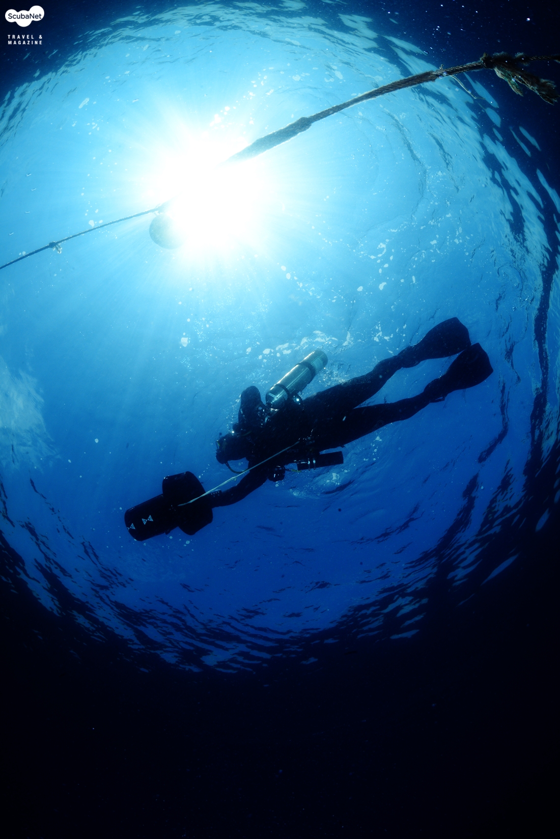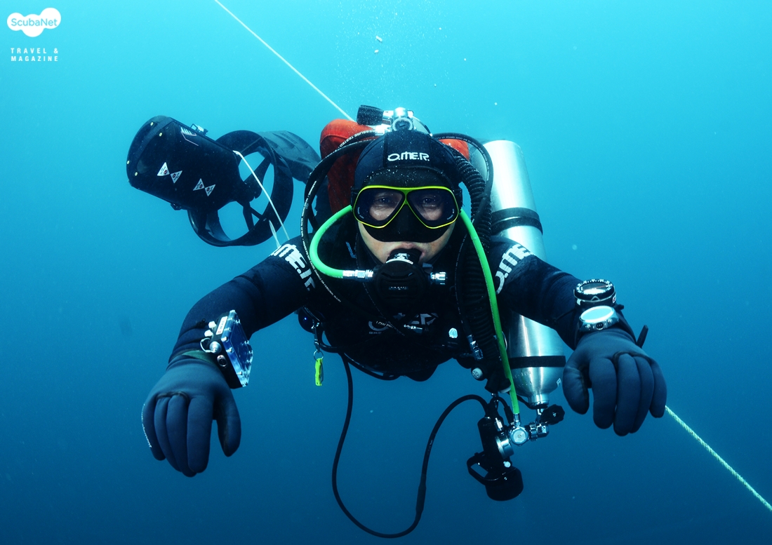 다이빙을 마치고 수면 근처에서 스쿠터로 이동하는 심재호 대표