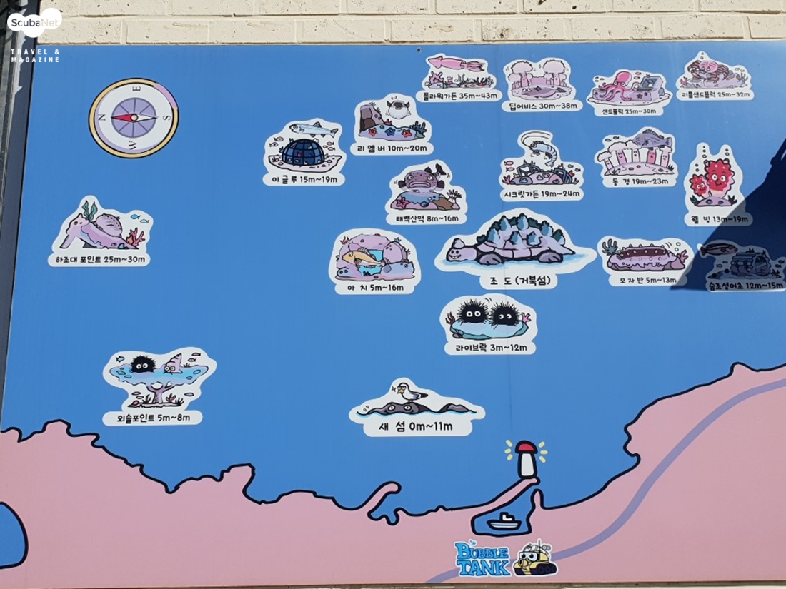 추석 당일이라 명절 답게 신혼부부 다이버와 아버지와 아들, 가족 다이버들이 장비준비를 하고 있었다. 리조트 외부에는 버블탱크에서 진행할 수 있는 다이빙 포인트 맵이 귀엽게 걸려있다. 그냥 단순한 그림 같지만 수심과 포인트의 위치가 상당히 정확하게 표기 되어있었다. 그리고 많은 세척 통들과 장비거치대가 있어 다이빙 종료 이후 기다림 없이 세척과 동시에 건조를 할 수 있도록 넉넉하게 준비가 되어 있었다.
