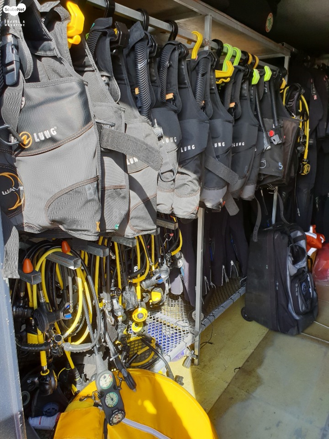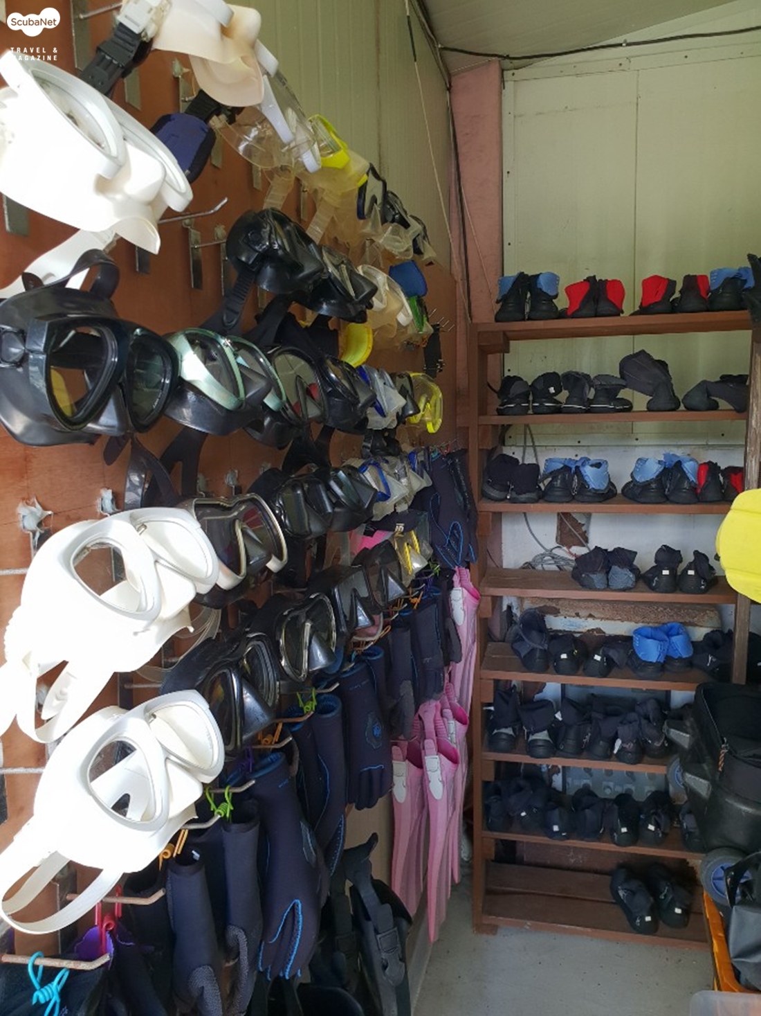 리조트를 이용하는 다이버를 위한 장비세척통과 장비 렌탈실그리고 한쪽의 컨테이너 박스에는 장비가 없는 분들을 위한 렌탈장비가 준비가 되어 있었다. 사실 대부분의 리조트 렌탈장비는 여러 사람들이 사용하기에 깨끗하게 유지관리가 힘들지만 이곳 버블탱크의 렌탈장비는 감히 개인장비라고 해도 될 만큼 좋아 보였다. 탱크 충전구역도 깔끔하게 정리되어 있었고 일반 기본 싱글탱크부터 더블장비세트, 사이드마운트 전용 좌측 밸브 탱크까지 다양한 다이버의 취향을 고려해 준비가 되어 있는 리조트였다.