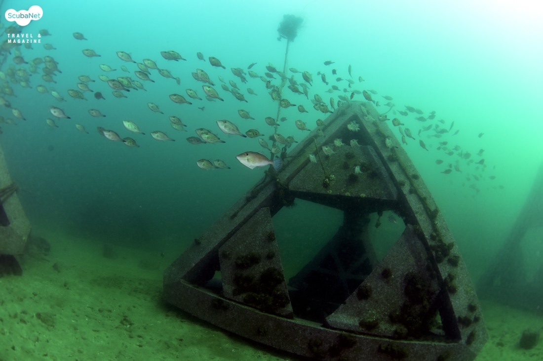 첫 번째 포인트는 리조트의 손님 중 오픈워터 해양실습 중인 팀과 동행하였고, 항에서 약 5분거리에 있는 조도라는 포인트를 들어가게 되었다. 조도의 포인트는 5m~12m 수심에 바닥지형은 암반으로 되어 있고 무엇보다 하강라인이 설치되어 있어 아직 중성부력이 미숙한 초보 다이버가 연습하기는 좋은 환경이었다. 남쪽으로 약 5분정도만 이동하면 숲조성어초 포인트가 있는데 삼각, 사각, 원형어초들이 있고 우럭, 볼락, 쥐치 등 다양한 어종들을 만나 볼 수 있었다.