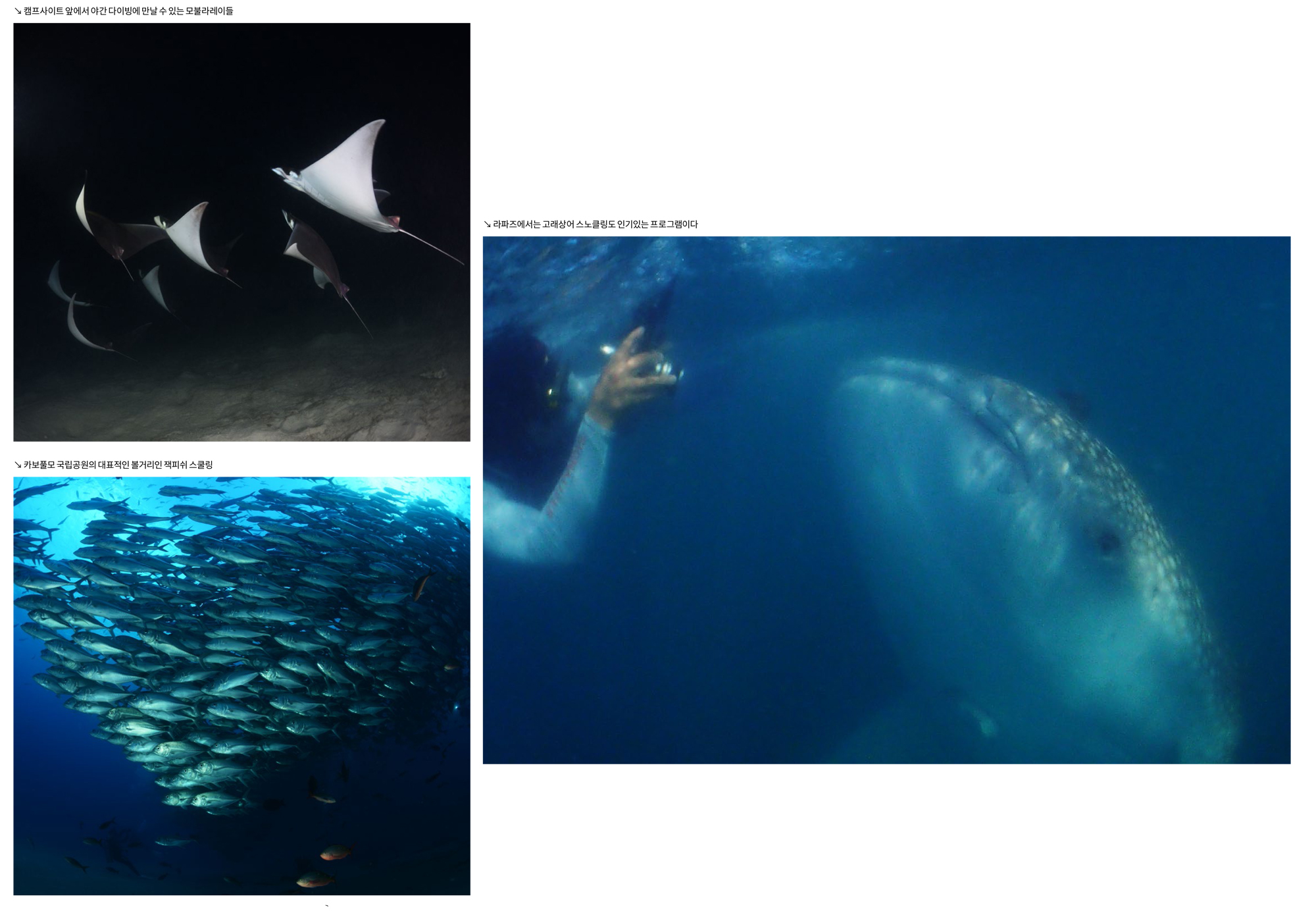 또한 스쿠버넷과 함께 2019년 5월에 MV 발렌티나를 이용한 모불라 점핑 투어를 진행한다. 리브어보드를 이용하여 모불라레이들이 떼로 모여서 춤을 추는 장면을 만나려는 것이다. 물론 바다사자와 고래상어도 볼 수 있다. 일정은 2019년 5월 29일~10월 6일이다.