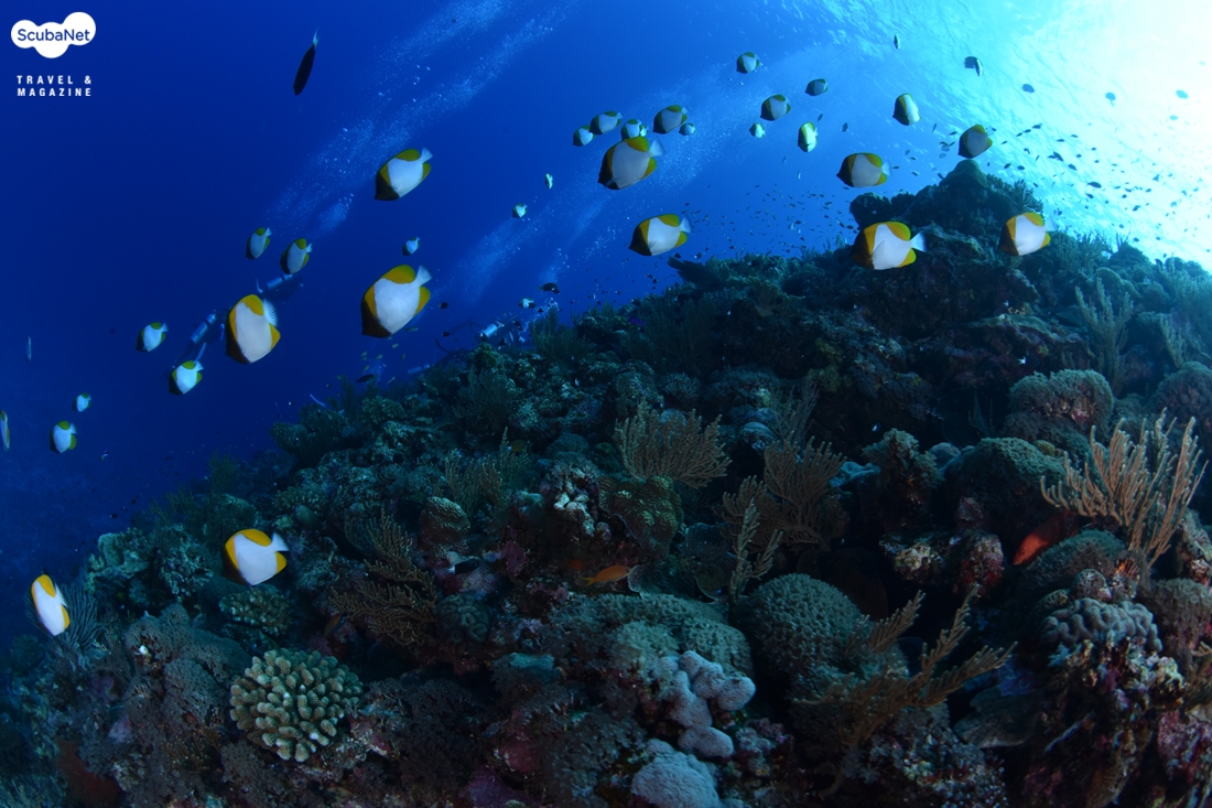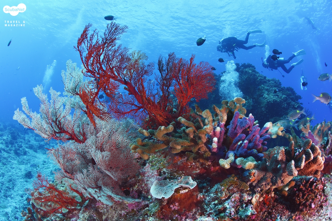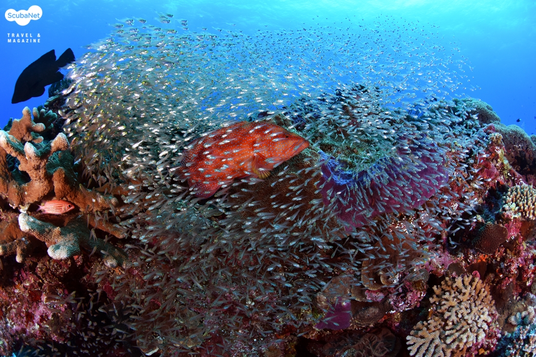 수심이 깊지 않은 곳에서는 파란 물색에 어우러진 형형색색의 연산호가 꽃밭처럼 펼쳐졌고, 바리과의 꽃돔들과 자리돔, 카디날피쉬 등 많은 개체수의 어종들이 있었다. 사막 같은 모래지형에는 머리만 빼고 있는 가든일과 리본모레이 및 옐로핀 고트피쉬들의 무리, 거대한 만타 그리고 간혹 보이는 자이언트 트레발리가 우리 다이버들을 반겨 주기도 하였다.