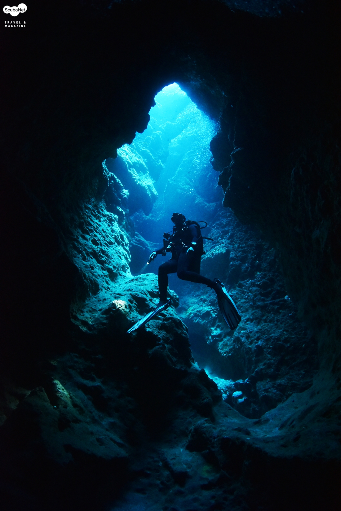 천장에서 내려오는 푸른빛과 다이버