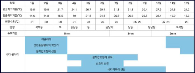 상급 다이버 전문 다이빙파도가 높고 기상이 좋지 않아 입출수시 다이버의 안전 때문에 상급자 포인트를 전부 가지는 못했지만 수중 시야는 취재가 끝날 때까지 30m~40m 앞까지 보일 정도로 바닷속은 정말 투명했다. 다이빙은 입출수가 위험하지 않은 곳에서 일반과 상급의 대표 포인트로 진행했는데 토나키지마의 블루홀, 야카비 섬 주변 등이었다.
