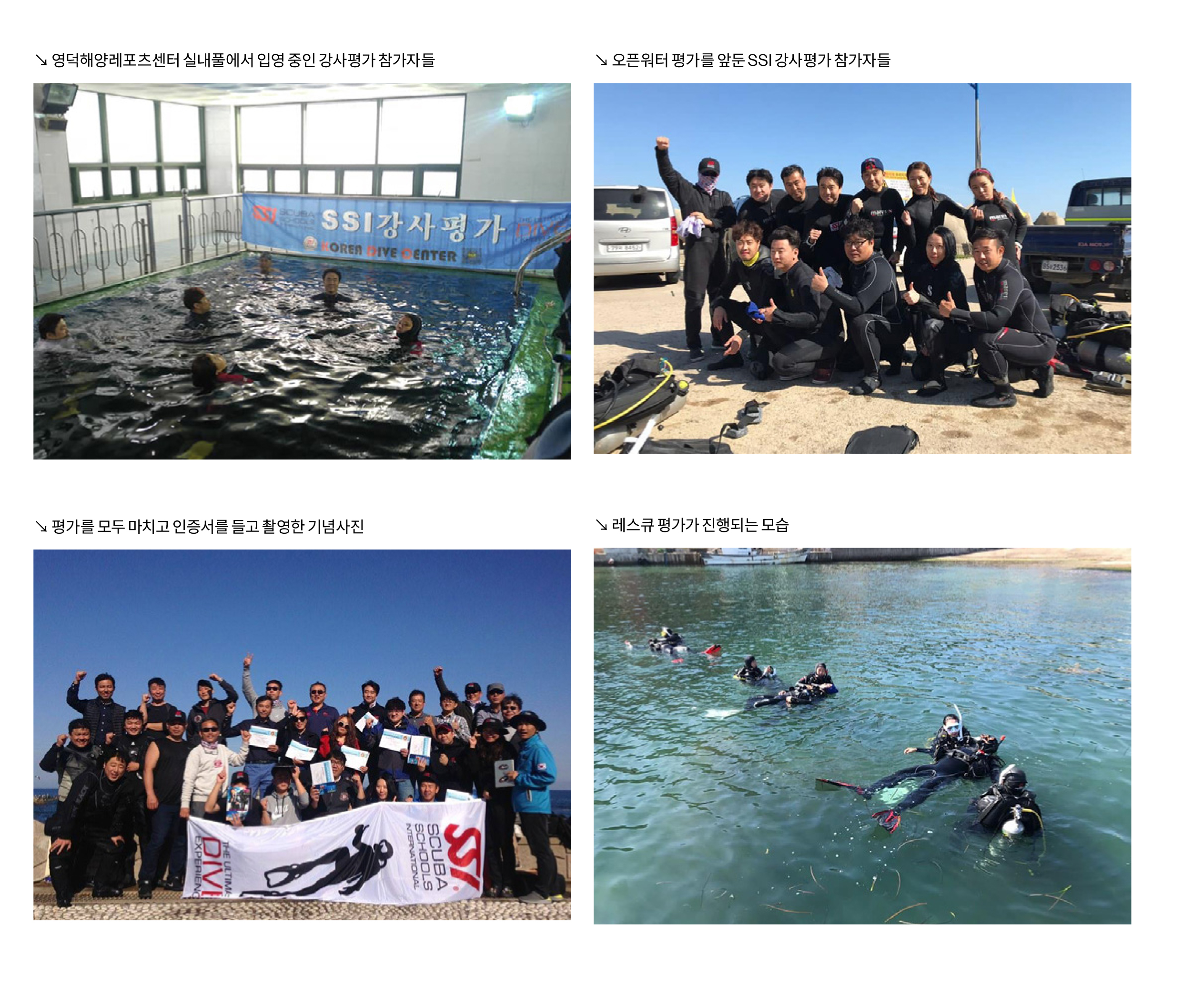 이번 SSI 코리아의 강사평가에는 여러 SSI 강사 트레이너들의 교육을 받은 11명의 강사후보생들이 참가하였다. SSI 코리아 진신 본부장과 김태훈 평가관이 아카데믹 세션과 제한수역 세션 그리고 오픈워터 세션을 맡아서 평가하였는데 평가 장소로는 영덕해양레포츠센터와 대진리조트를 이용했다. 영덕해양레포츠센터에는 강의실과 수영장, 숙소가 있으며, 대진리조트 앞의 비치포인트에서 오픈워터 다이빙이 가능하기 때문에 강사평가 과정을 진행하기에는 안성맞춤이기 때문이었다.