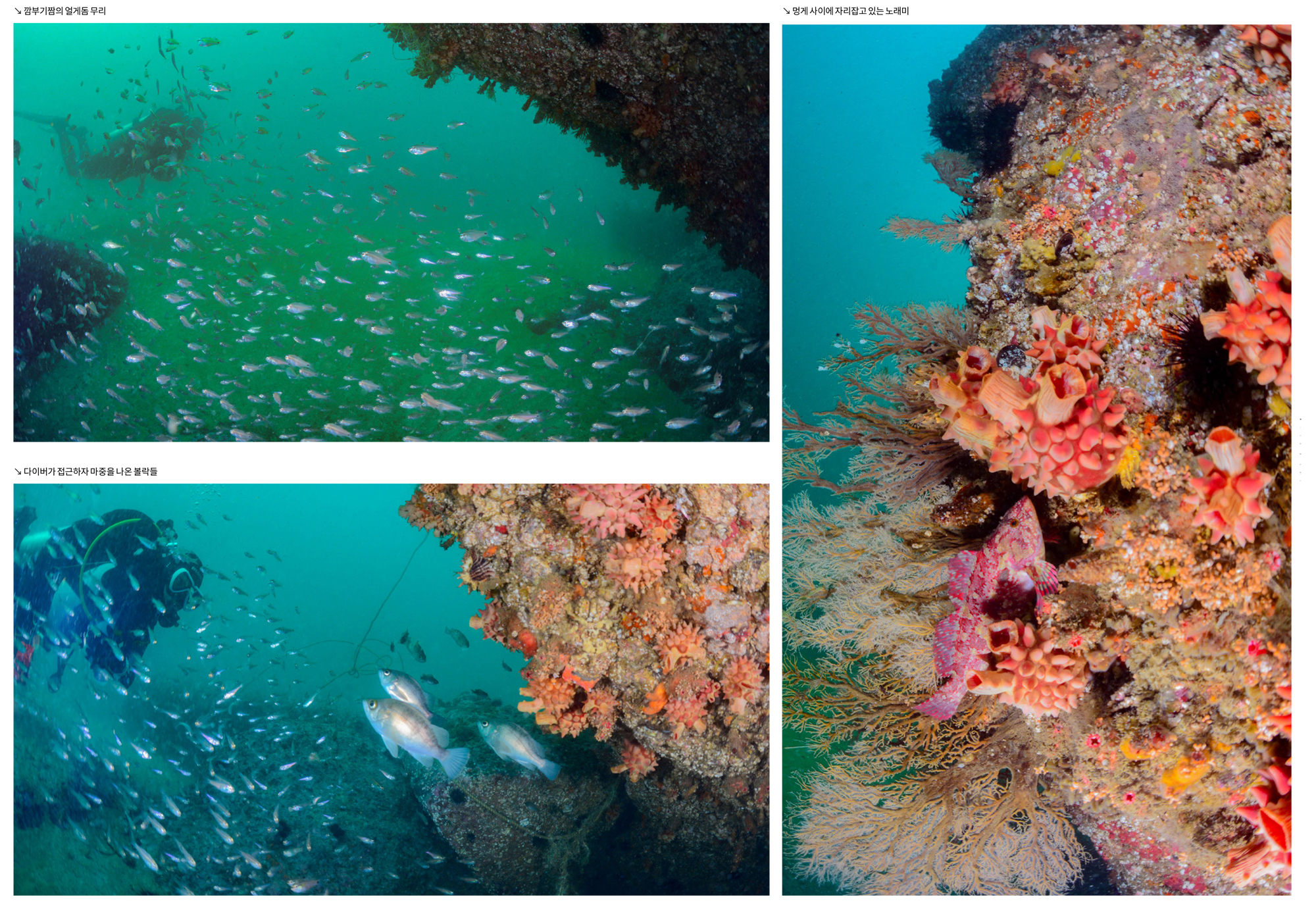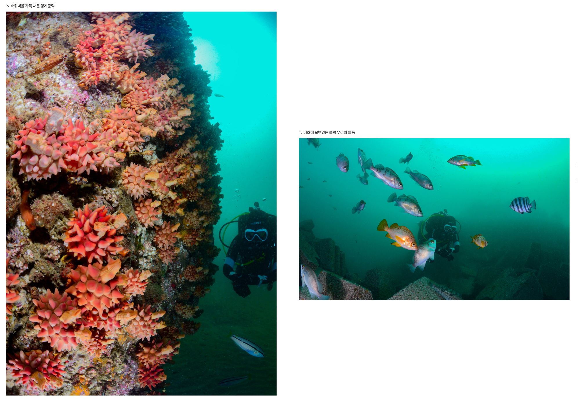수심 12m 바닥에서 수심 20m 이상까지 점점 깊어지는 지형에 놓여 있는 큰 암반지대였다. 암반의 벽에는 멍게들이 다닥다닥 붙어 있었고, 암반 옆의 모래 지역에는 넙치들이 종종 눈에 띄었다. 간혹 얼게돔들이 무리를 이루고 있는 곳도 있었다. 암반의 벽을 오른쪽 어깨에 두고 시계 방향으로 돌아보기로 했는데 중간에 어초들이 쌓여 있는 곳에서 더 깊은 곳에 있는 암반으로 건너간 듯했다.