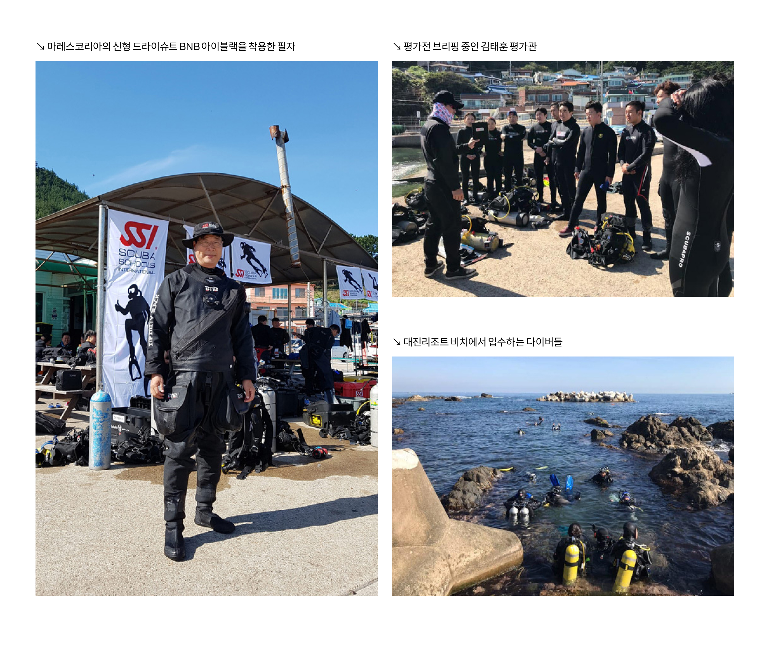 지난 10월 20일~21일 경상북도 영덕군 대진리조트에서 SSI 코리아의 파티가 있었다. 본부에서 주관하는 강사평가일에 강사트레이너들과 후보생들이 모이는 일정에 맞춰 펀다이빙 투어를 만들어서 함께 다이빙하며 즐기자는 취지로 진행된 행사였다. SNS를 통해 빠르게 기획되고 홍보된 행사 덕에 연인원 100명에 가까운 SSI 다이버들이 모인 성대한 행사가 되어 성공적으로 개최되었다. 필자는 최근 마레스 코리아에서 개발하여 신규 공급하고 있는 BNB 아이블랙 드라이슈트의 시착을 겸해서 행사에 참가하였다.