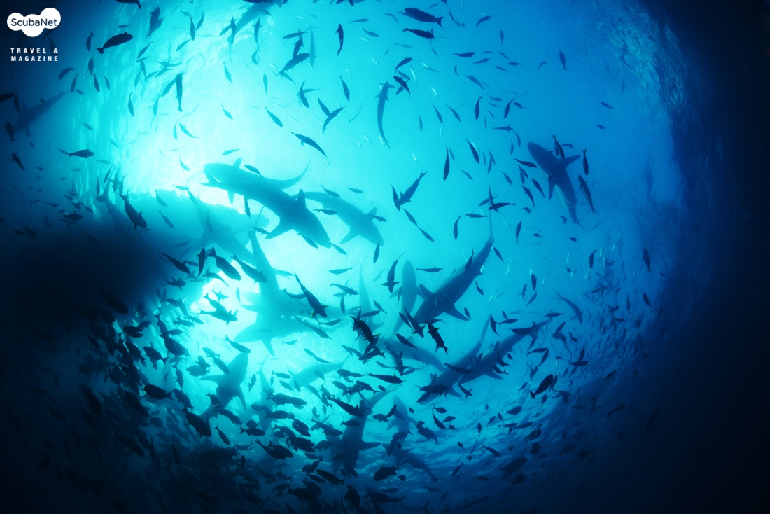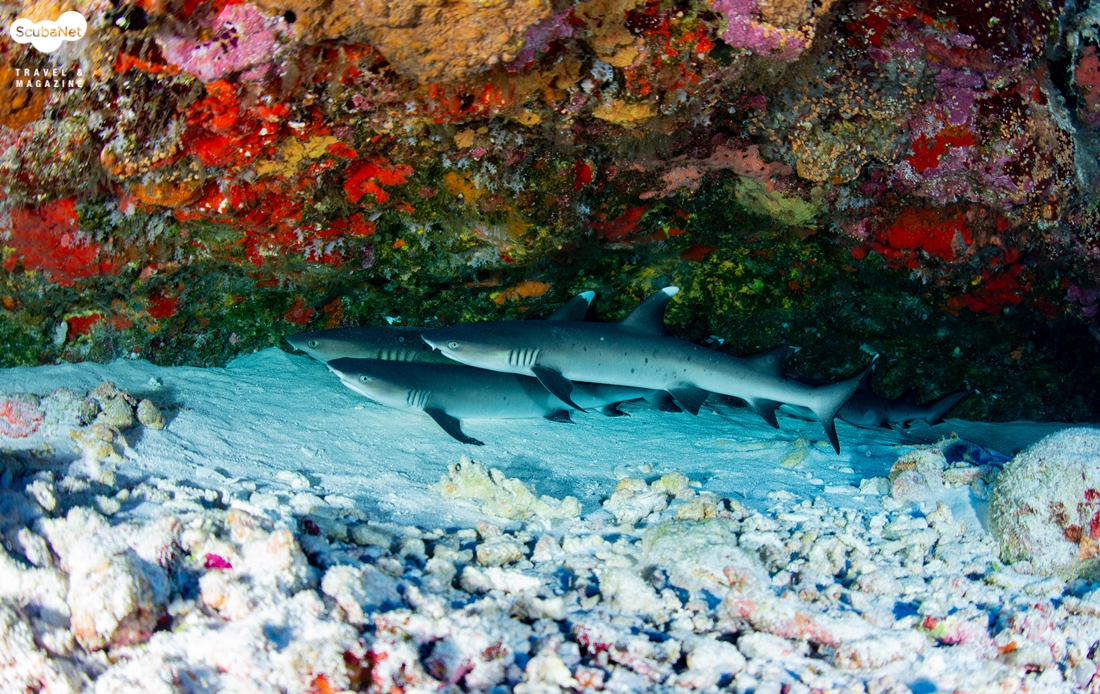 몰디브 딥사우스의 화이트팁상어 무리