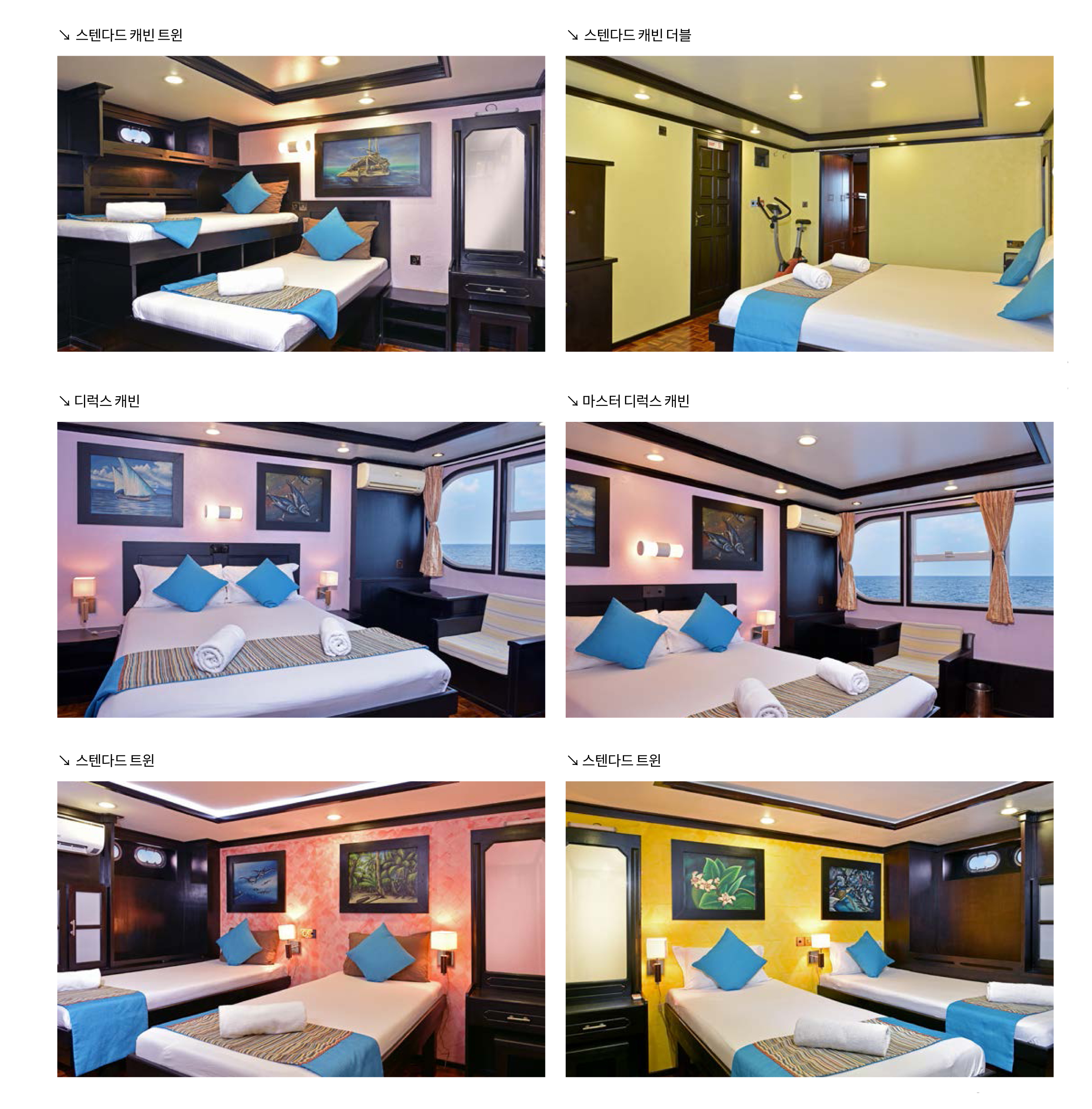캐빈은 어퍼덱에 마스터 디럭스 캐빈 1개와 디럭스 캐빈 2개, 로우덱에 8개의 스텐다드 더블베드 캐빈이 있으며, 1개의 벙커 캐빈이 있다. 따라서 최대 24명의 다이버가 이용할 수 있다.