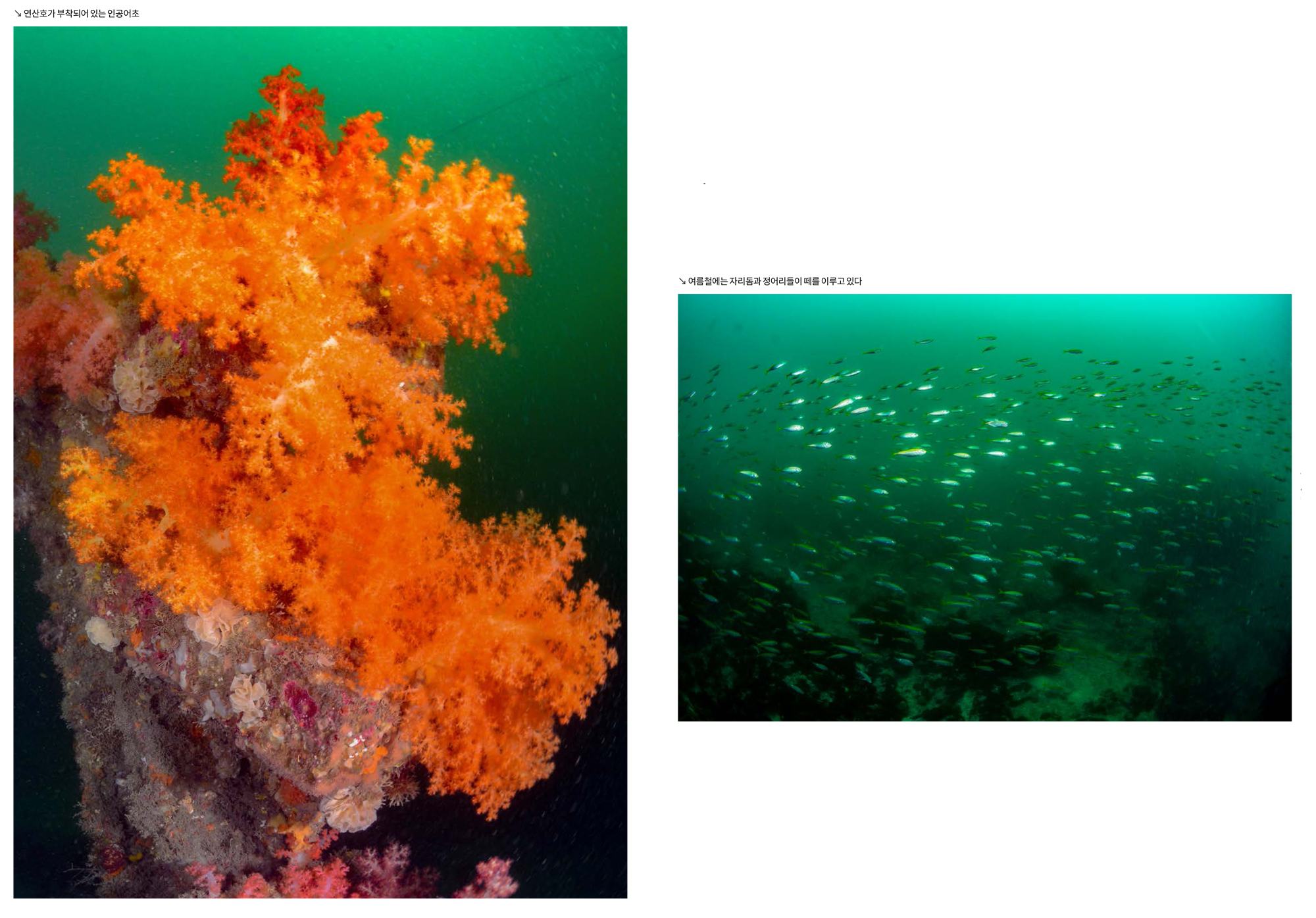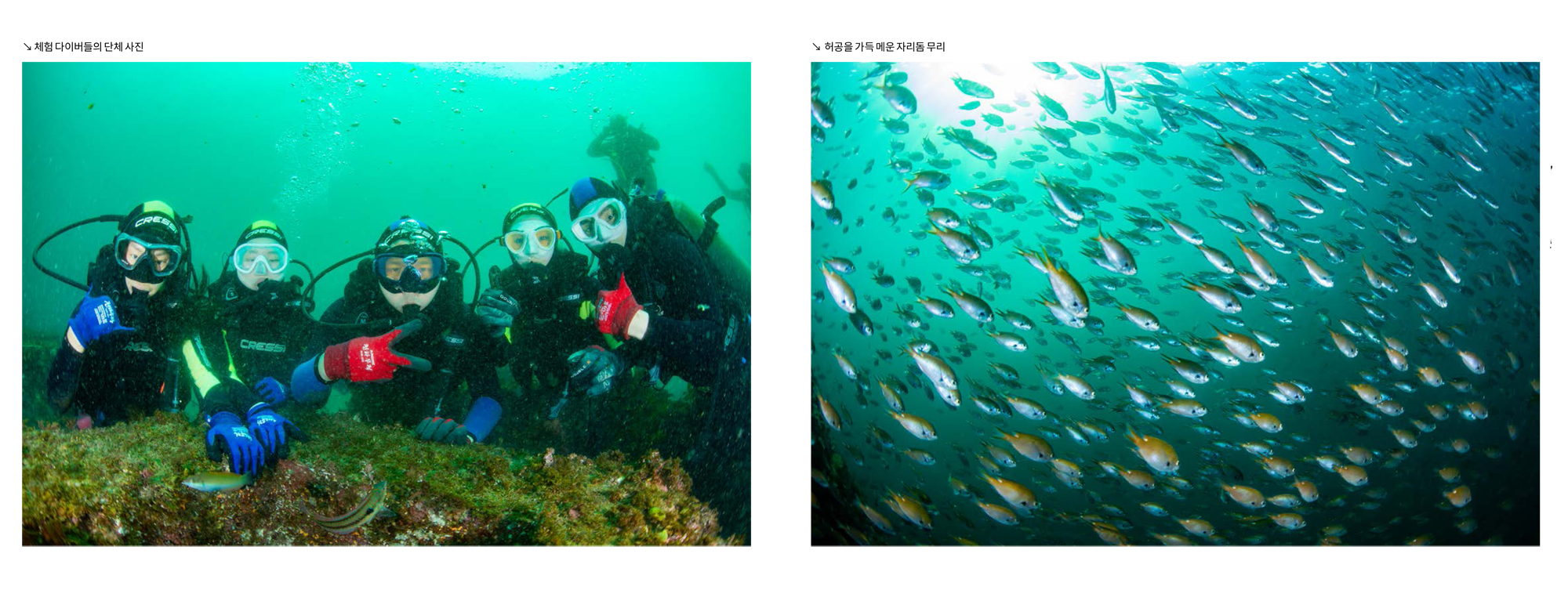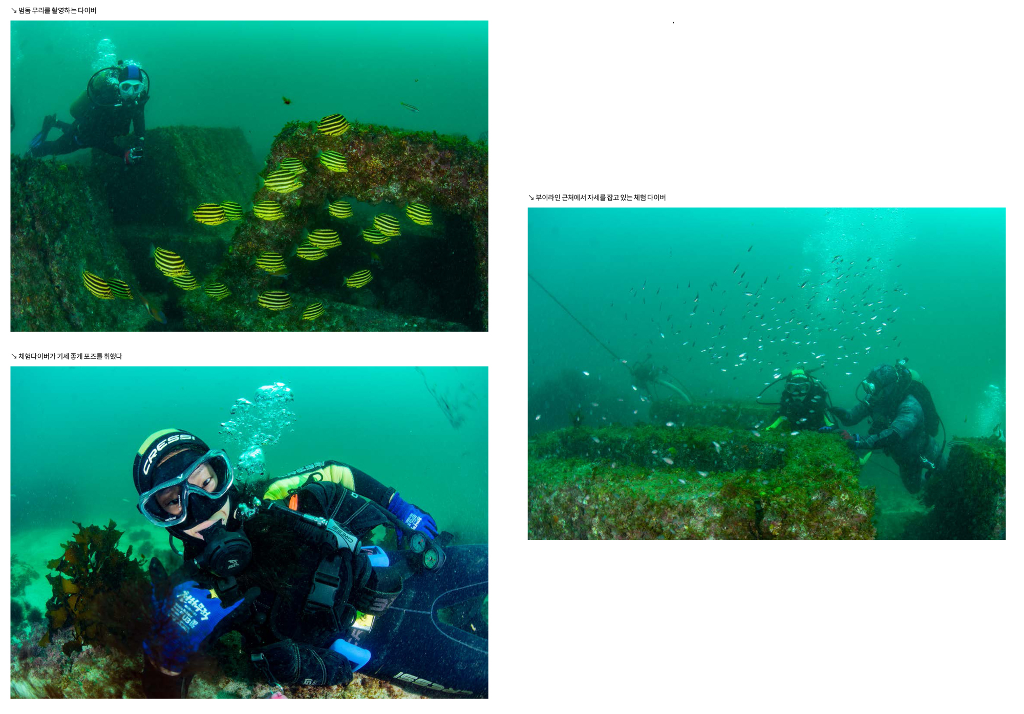 수심도 얕고, 조류의 영향도 크지 않은 곳이라 초보 다이버들도 안전하게 다이빙을 즐기며 체험을 즐길 수 있다. 넓은 곳에 흩어져 있는 수중조형물들과 숨어 있는 해양생물을 찾는 재미를 느낄 수 있을 것이다.