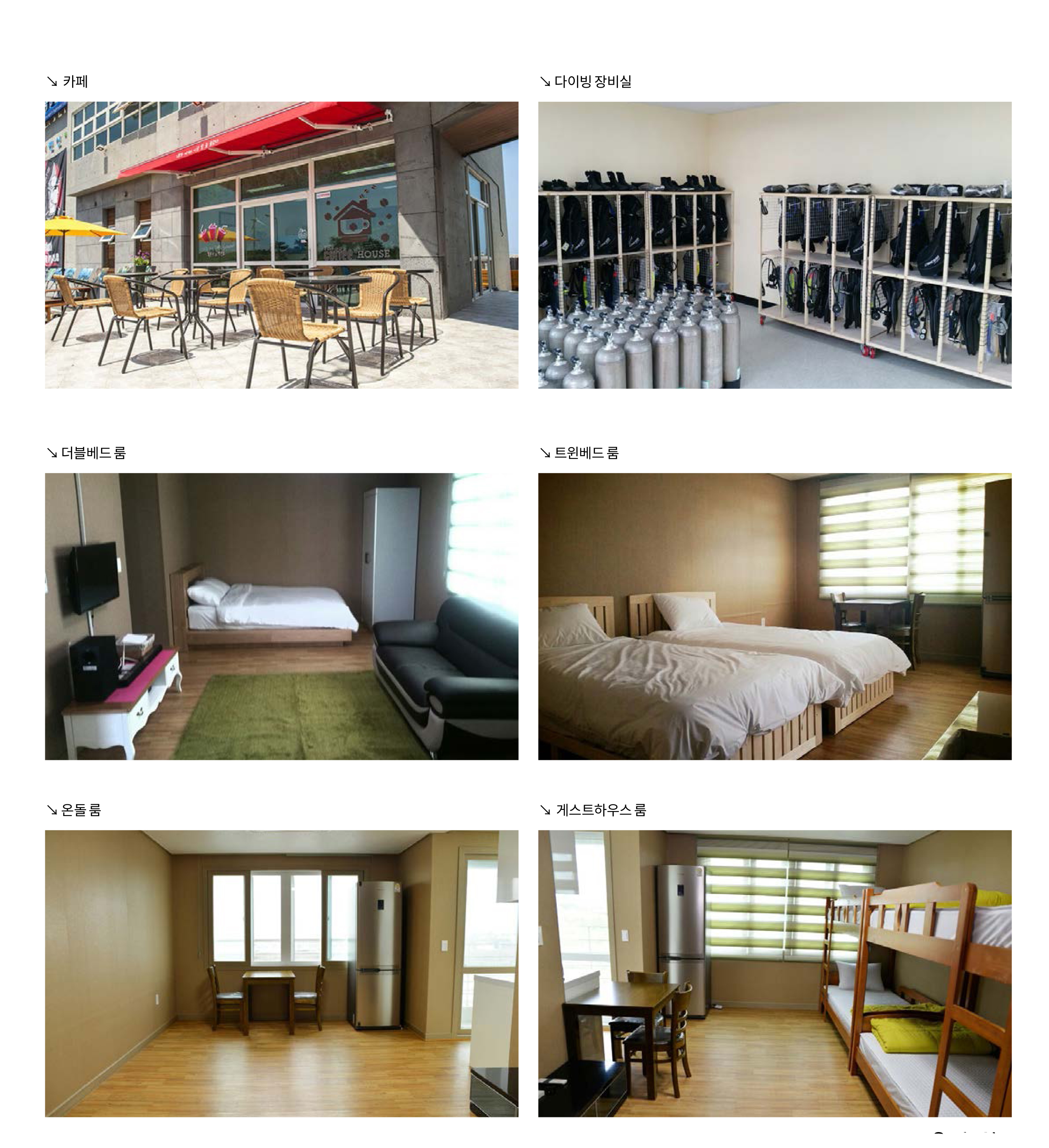 숙식 일체형 다이브리조트트윈베드, 더블베드, 온돌방, 게스트하우스 등의 자체 숙소를 보유하고 있으며, 식당에서 직접 준비한 식사까지 제공해준다. 숙식과 다이빙을 포함한 패키지 프로그램도 제공하고, 숙박과 다이빙, 식사를 모두 별도로 제공하기도 한다. 외부 숙소나 식당을 이용하고 싶은 다이버들에게는 그만큼 선택의 폭을 넓혀주는 것이다.