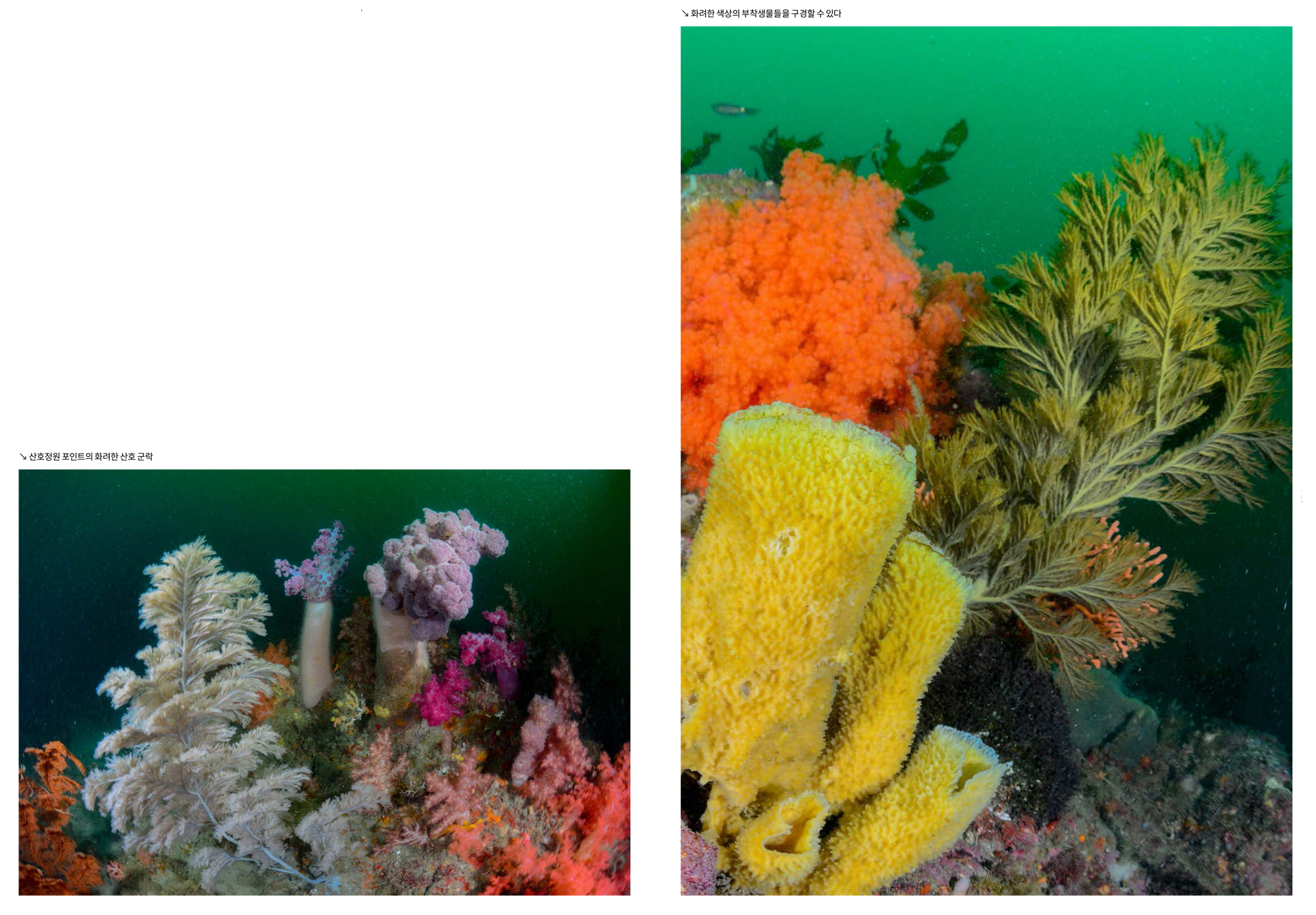 산호정원 포인트수심 20m~27m에 이르는 암반계곡이다. 감태가 무성한 수심 20m 내외의 암반 평원 사이에 움푹 패인 계곡이 있고, 계곡의 벽에 다양한 산호들이 서식하고 있다. 해송, 진총산호 등은 물론 가시수지맨드라미, 큰수지맨드라미, 분홍바다맨드라미 등의 연산호 군락들이 펼쳐져 있다. 수심이 깊기 때문에 감압에 유의하여야 하며 부이라인을 이용해서 하강과 상승을 할 수 있다. 제주바다목장 다이빙리조트의 포인트들 중에서 가장 화려한 곳이다.