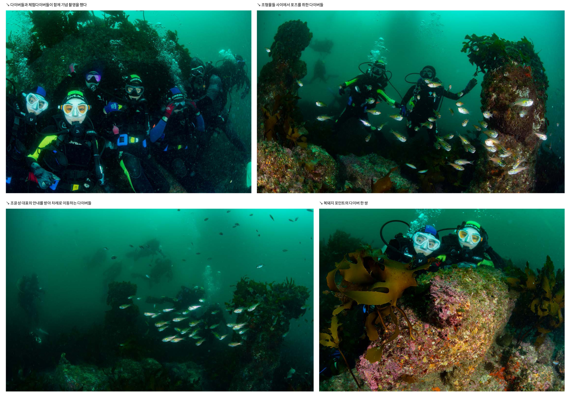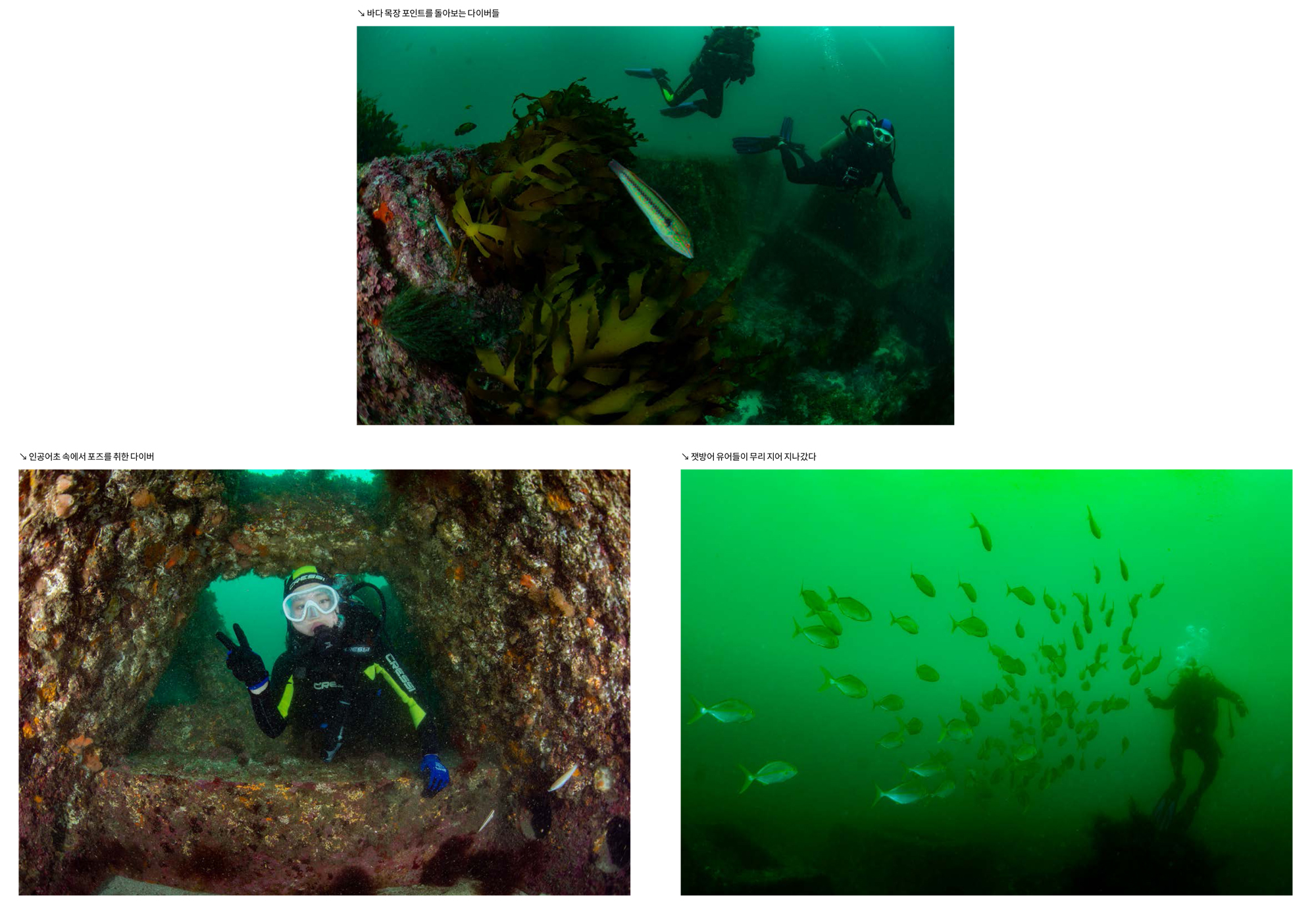 이번에 다이빙을 했을 때에도 잿방어 유어 무리, 범돔 무리, 돌돔과 강당돔, 독가시치 등이 무리지어 돌아다니는 것을 볼 수 있었다.