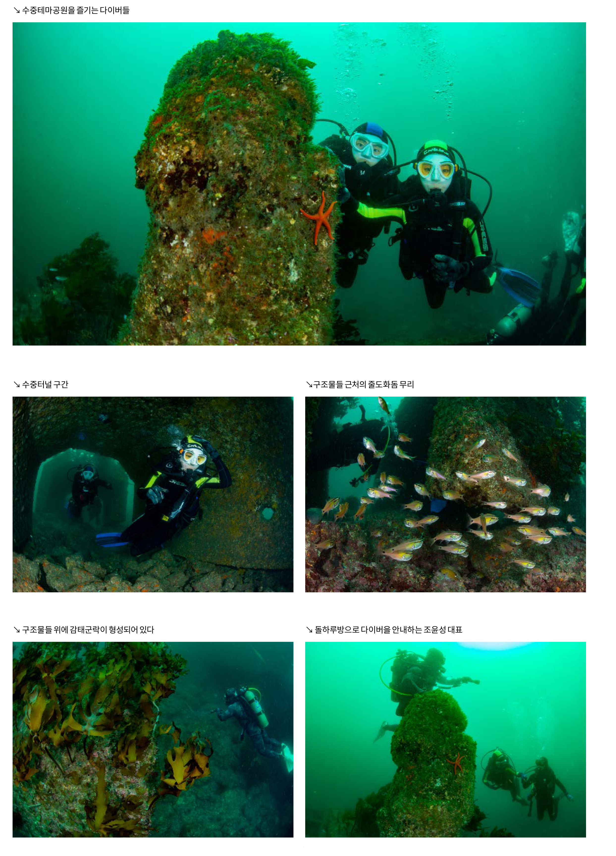 테마공원 포인트최대수심 15m에서 평균수심 11m에 위치한 넓은 암반지역에 다양한 수중조형물들이 놓여있는 곳이다. 지금은 부착생물들이 많이 붙어 있어서 어렴풋이 형태만으로 원형을 짐작할 수 있게 해주지만 수중터널, 돌하르방, 복돼지 등 다양한 조형물들을 찾아보는 재미가 있다. 강재 프레임 위에 조형물들이 설치되어 있어서 세월이 지남에 따라 부식과 침식이 일어난 것도 있지만 구조물들 자체가 해양생물들을 포집하는 효과들이 있다. 감태 숲으로 이루어진 평원에 구조물들이 놓이면서 굴국이 생겼기에 해양생물들에게 서식처, 은신처 역할을 하는 것이다.
