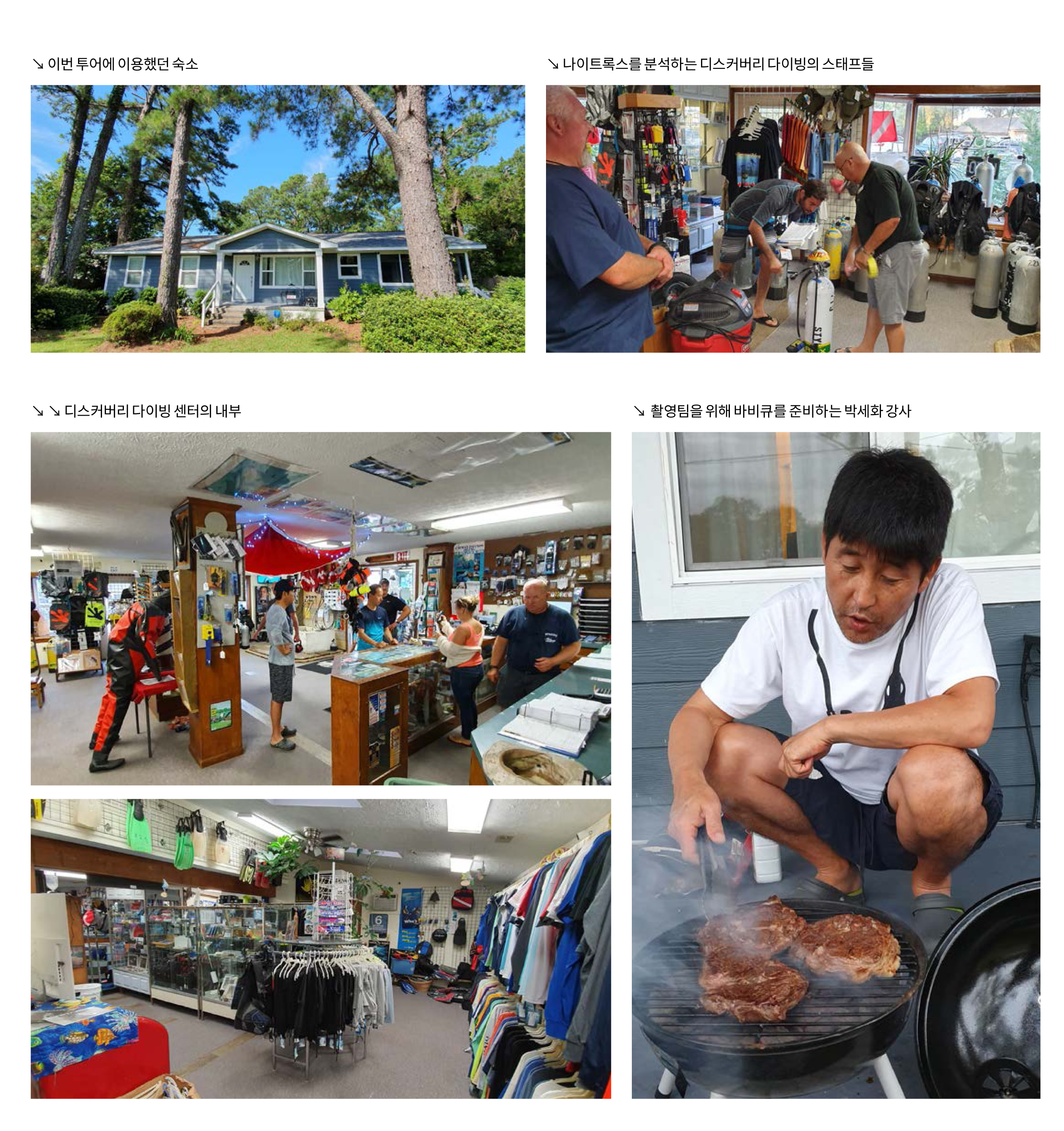 개인적으로 노스캐롤라이나의 난파선들에 출현하는 샌드타이거 상어들을 보고 싶었던 것이 이번 여행의 가장 큰 이유였다. 우리 팀은 역사적인 의미를 갖고 있는 독일의 U-보트 난파선과 에올루스 Aeolus 난파선 그리고 벤자민 터그 보트 Venjamin Tugh Boat 난파선에서 다이빙을 했고, 에올루스에서는 매우 많은 수의 샌드타이거 상어들을 만났고 근접하여 촬영할 수 있었다. 다큐멘터리 제작에 필요한 영상자료들를 만족스럽게 확보할 수 있었으며 덤으로 상어 매니아들이라면 가 볼만한 새로운 다이빙 여행지를 개발할 수 있었다. 스쿠버넷에서는 2020년 6월 중에 멕시코 라파즈 모불라 투어와 연계하여 노스캐롤라이나 난파선 다이빙을 진행할 계획이다.