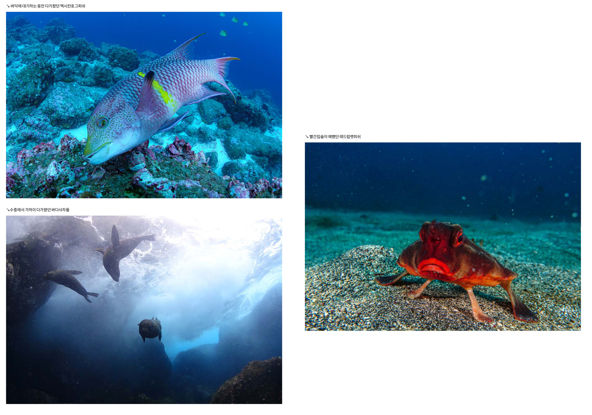 월프 섬 다이빙에서 처음 입수하여 만났던 햄머헤드 상어들의 엄청난 무리, 15m 정도 되는 잠수함 사이즈의 고래상어, 수중에서도 재롱을 부리는 바다사자, 바다 속에서 해조류를 갉아먹는 파충류 이구아나, 심해에서 올라와 클리닝을 즐기는 개복치 등은 그간 다이빙 여행을 다니면서 보고 싶었던 모든 것들을 시원하게 한번에 보여주는 끝내주는 경험이었다. 그 외 레드립벳피쉬를 비롯한 마크로는 덤이었다.
