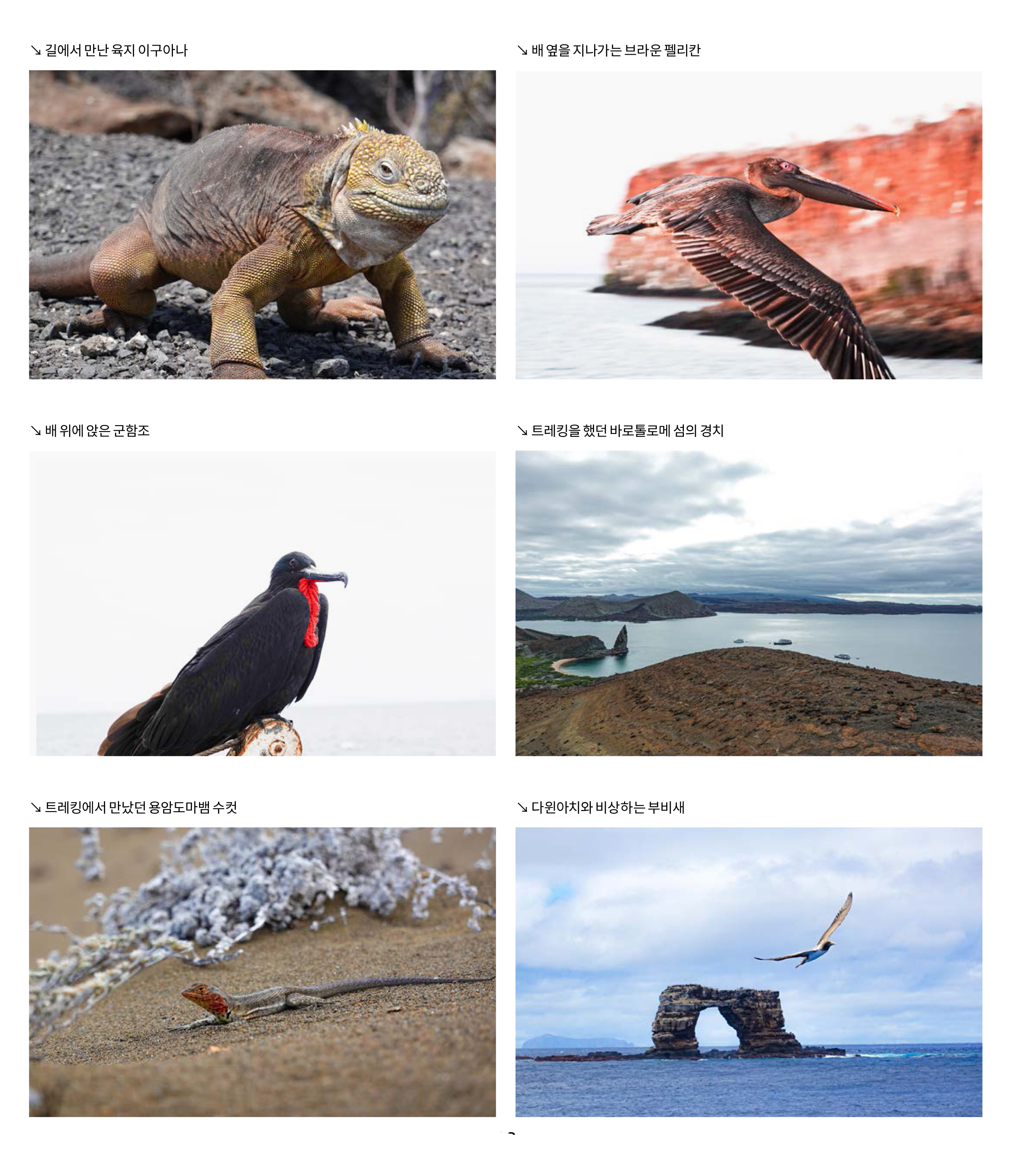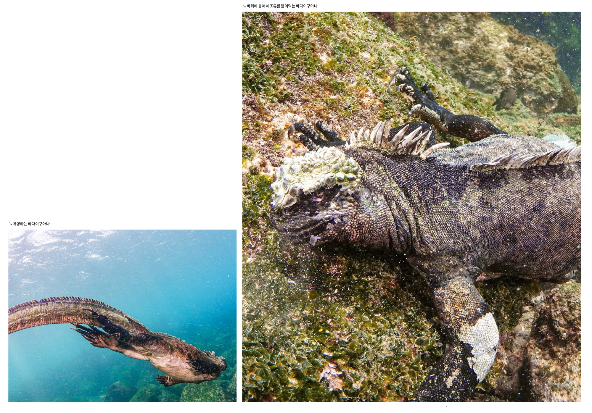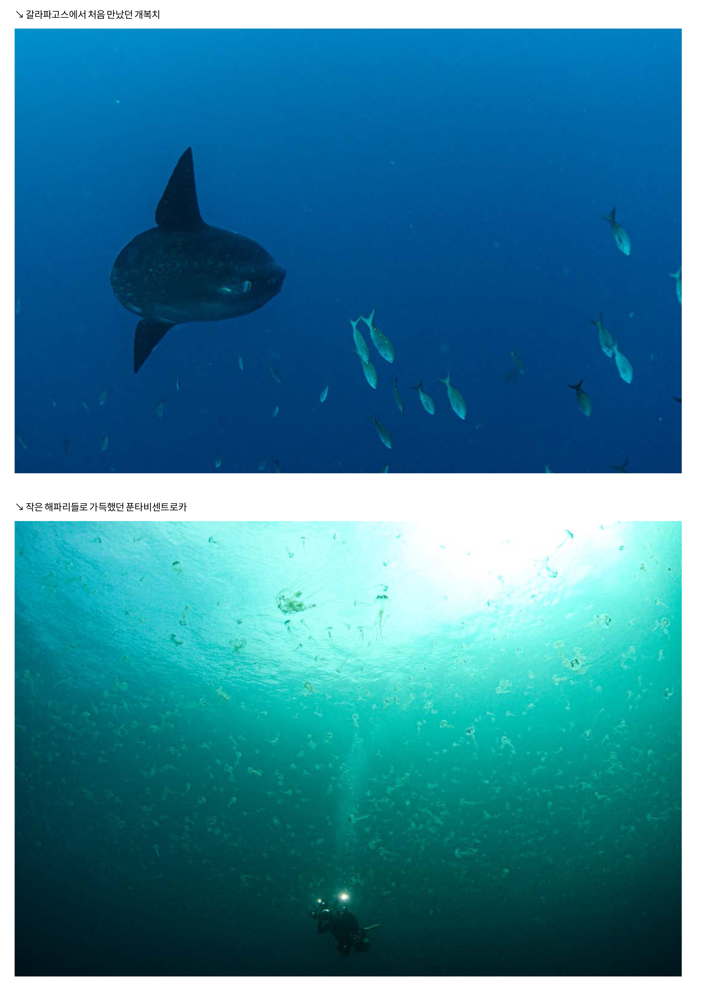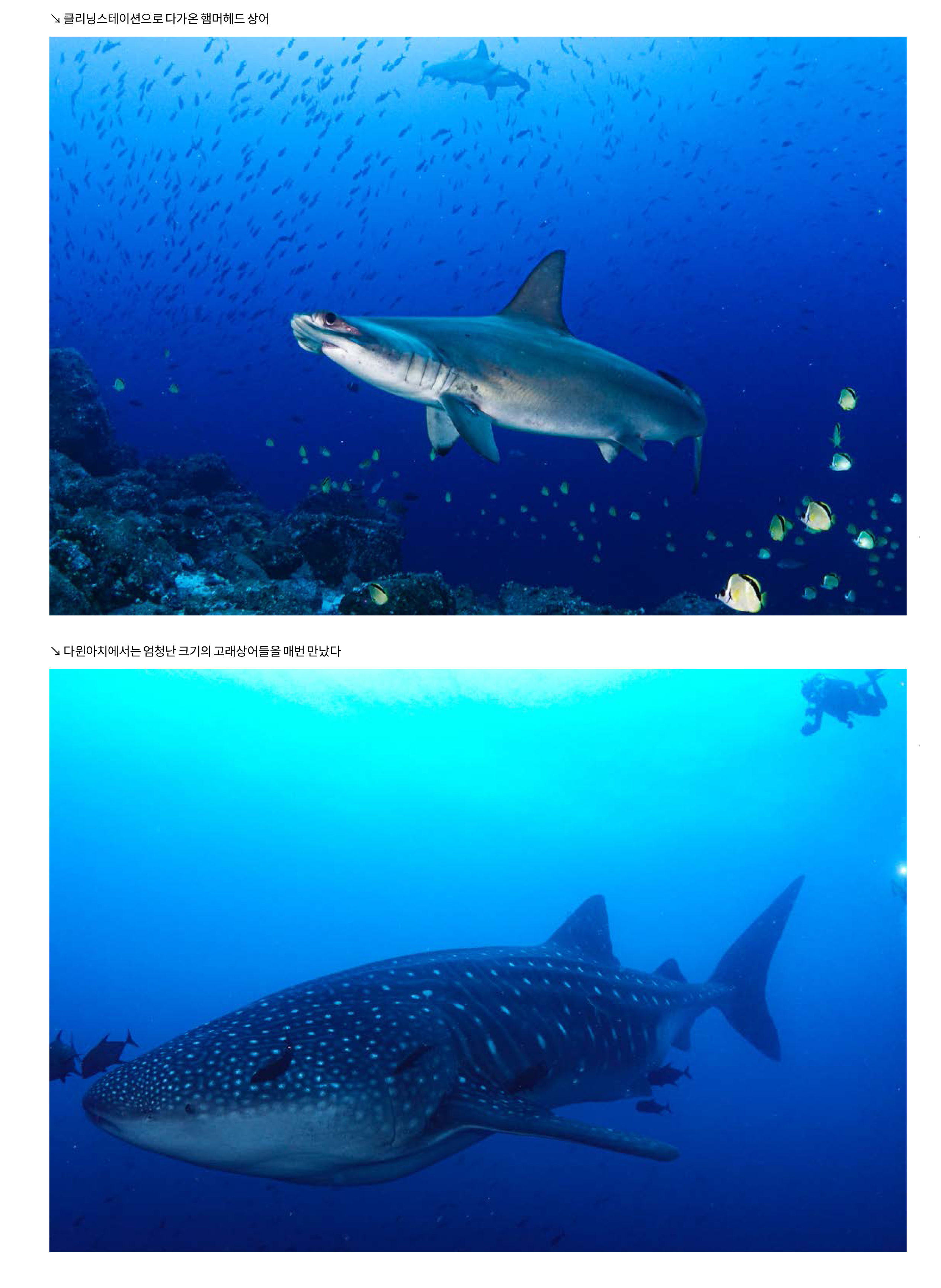 하지만 갈라파고스에 도착했을 때 그에게 그동안의 다이빙은 아무 것도 아니라는 생각이 들었다. 리브어보드 탑승을 기다리는 동안 길에서 만난 육지 이구아나, 배로 가는 길에 만난 등표 위의 바다사자, 배 근처에서 먹이를 찾는 펠리칸, 항해하는 배를 쫓아 글라이딩을 즐기는 군함조 등 다이빙을 하기 전에 갈라파고스의 육상 생태에 먼저 반해버린 것이다. 이후로도 항해 중에 잠깐 들린 바로톨로메 섬 트레킹과 다이빙 사이트에서 만난 섬들의 지형 등 모든 것이 신비롭고 새로웠다. 하지만 그동안 고대해왔던 갈라파고스의 바다는 그보다 더욱 그를 신나게 했다.