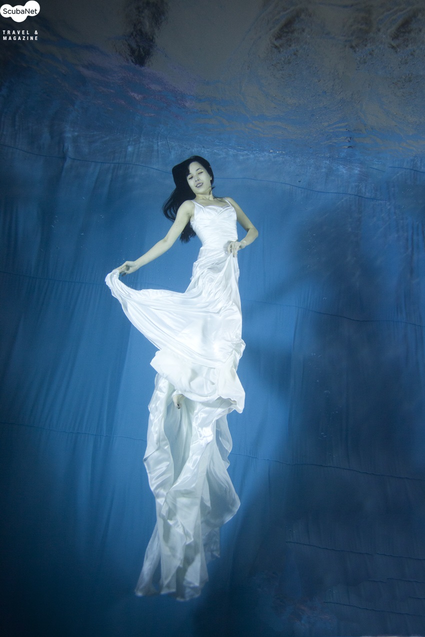 수중인물 사진의 시도일반적으로 사진에는“순수예술사진”, “상업사진”, “기록/보도사진” 등의 여러 분야가 있겠지만, 대부분의 작품 활동이 모두 지상에서 이루어져 왔다고 보아야 할 것입니다.지금까지 수중사진의 세계는 바다의 자연 풍광이나 수중생물을 담은 사진이 절대 다수를 차지해 왔고, 인물 사진이라고 해봐야 광각렌즈를 이용해서 수중 풍경을 담으면서 구도와 재미 혹은 주제의 전달을 위한 보조 수단으로 등장하는 실루엣 정도에 그치는 경우가 대부분이었습니다. 그 외에는 일반 스쿠버다이버들이 투어를 다녀오고, 귀한 수중생물을 목격했다는 사실을 증명하기 위한 소위 인증샷 정도에 그칩니다. 이처럼 국내에 작품으로써 순수한 수중인물 사진이 귀한 이유는 여러 가지가 있겠지만, 피사체가 되어 줄 전문 모델이 귀하다는 것 또한 원인일 것입니다.그런 의미에서 보자면 지난 2012년 3월 18일 잠실스킨스쿠버에서 주관하고 스쿠버넷, 수작코리아가 후원한 “제1회 잠실스쿠버풀 수중모델 촬영대회”는 지금까지 잘 갖추어진 조명과 전문모델, 의상을 갖춘 스튜디오 환경 그대로를 수중으로 옮겨 인물 사진 중심으로 진행된 흔치않은 수중사진 대회였고, 수중사진 애호가들에게 역시 수중 전문 모델과 함께 호흡하며 사진을 찍을 수 있는 절호의 기회였습니다.