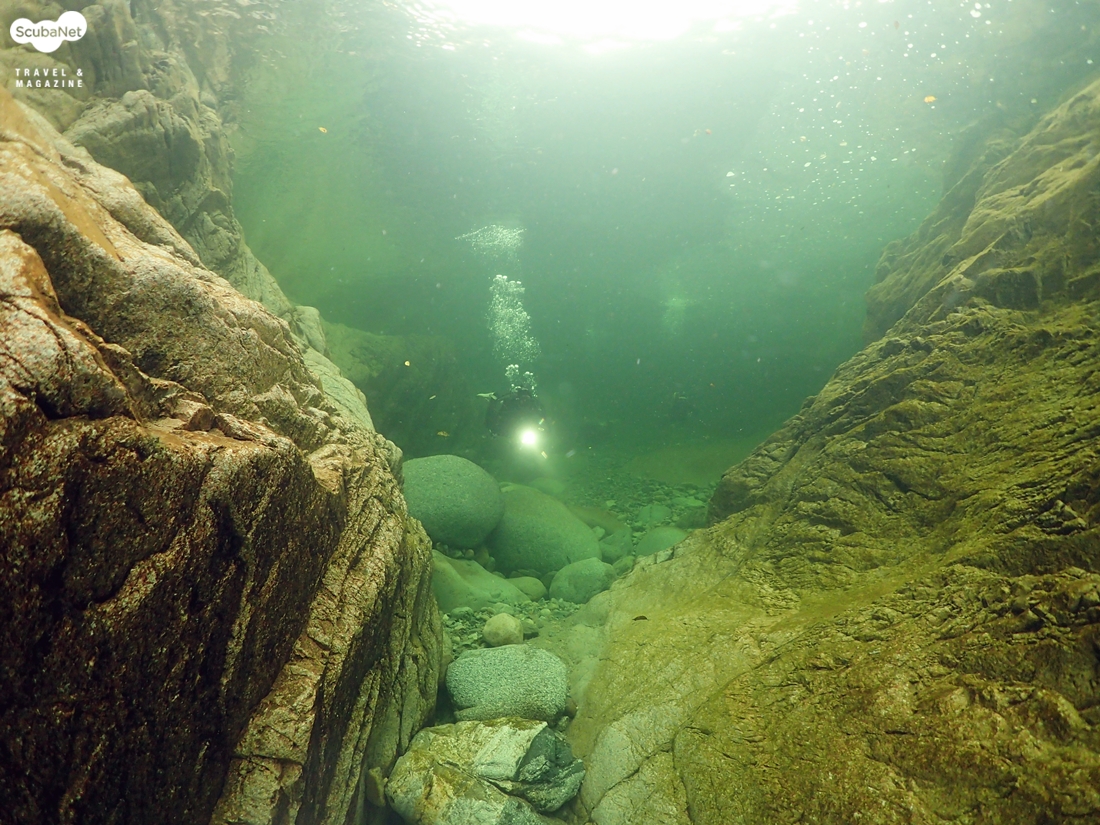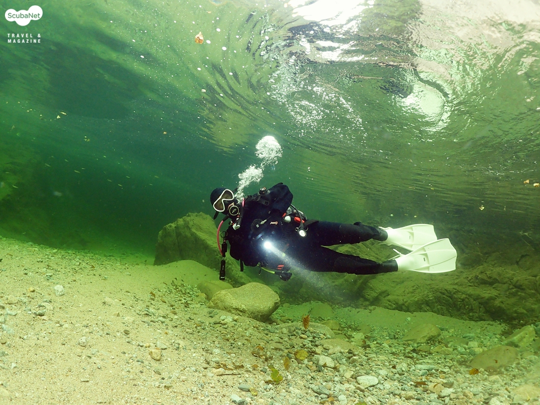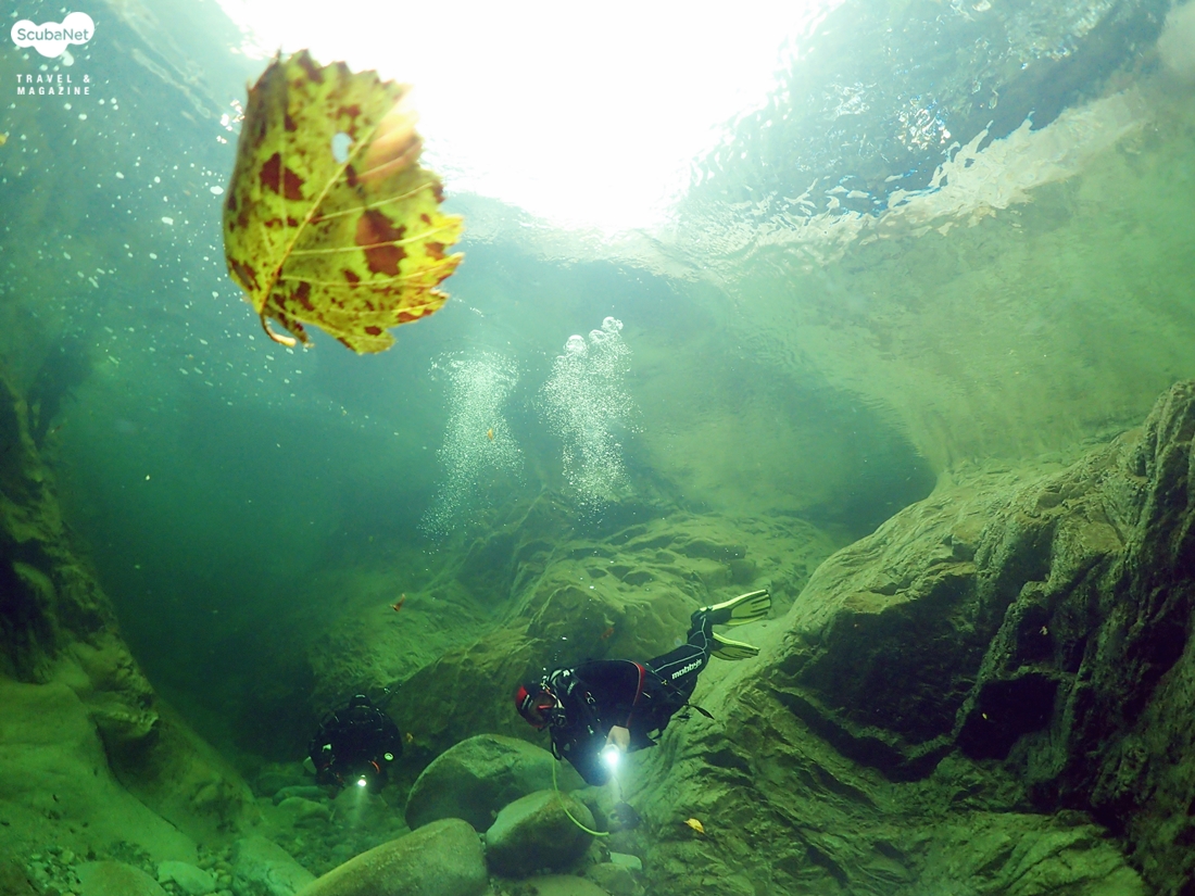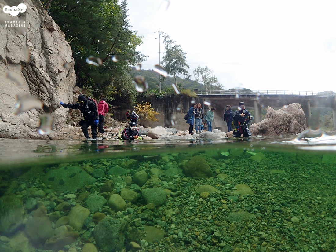 이날 수온은 약 13℃가 나왔다. 햇살이 비추면 물속의 모습이 더 아름답지 않을까 하는 생각이 들면서 아쉬운 다이빙을 이어 나갔다. 처음 들어간 일행들이 30분 정도를 하고 나왔다. 이제 내가 들어갈 차례다. 계곡의 물속은 어떤 모습으로 되어 있을까? 물고기는 얼마나 살고 있을까? 물속은 얼마나 깨끗할까? 유튜브에서 본 모습 그대로인가? 등등 많은 호기심을 갖고 다이빙을 시작 했다. 그리 크지는 않지만 30분이라는 시간을 즐기기에는 부족하지 않았다.