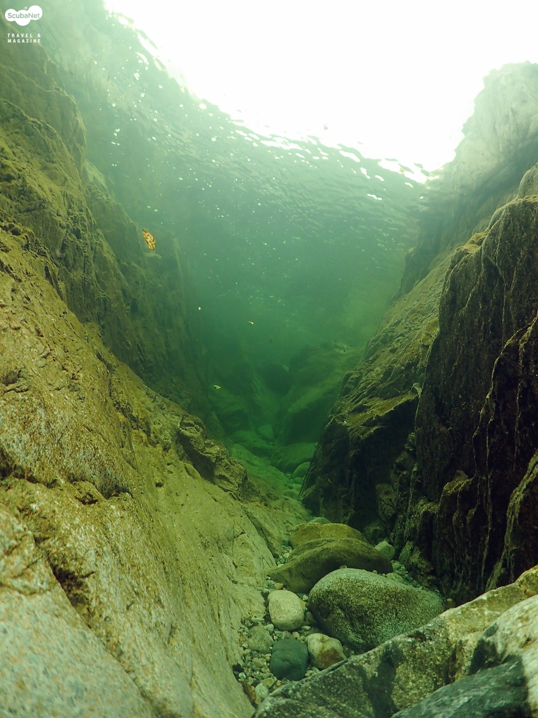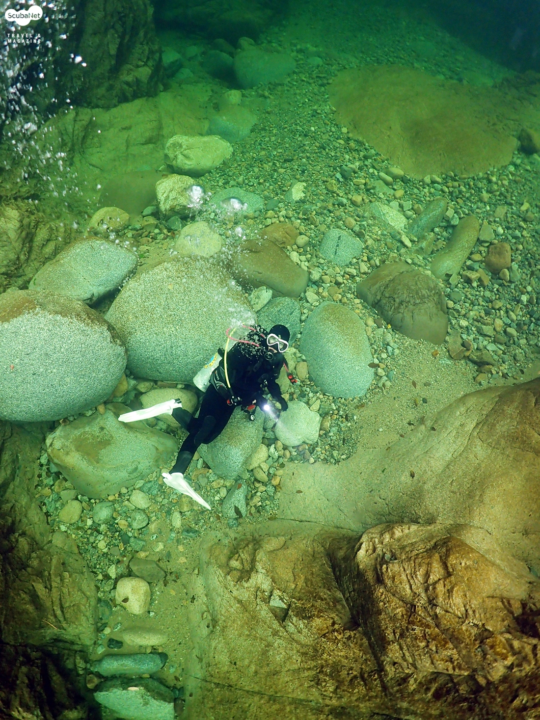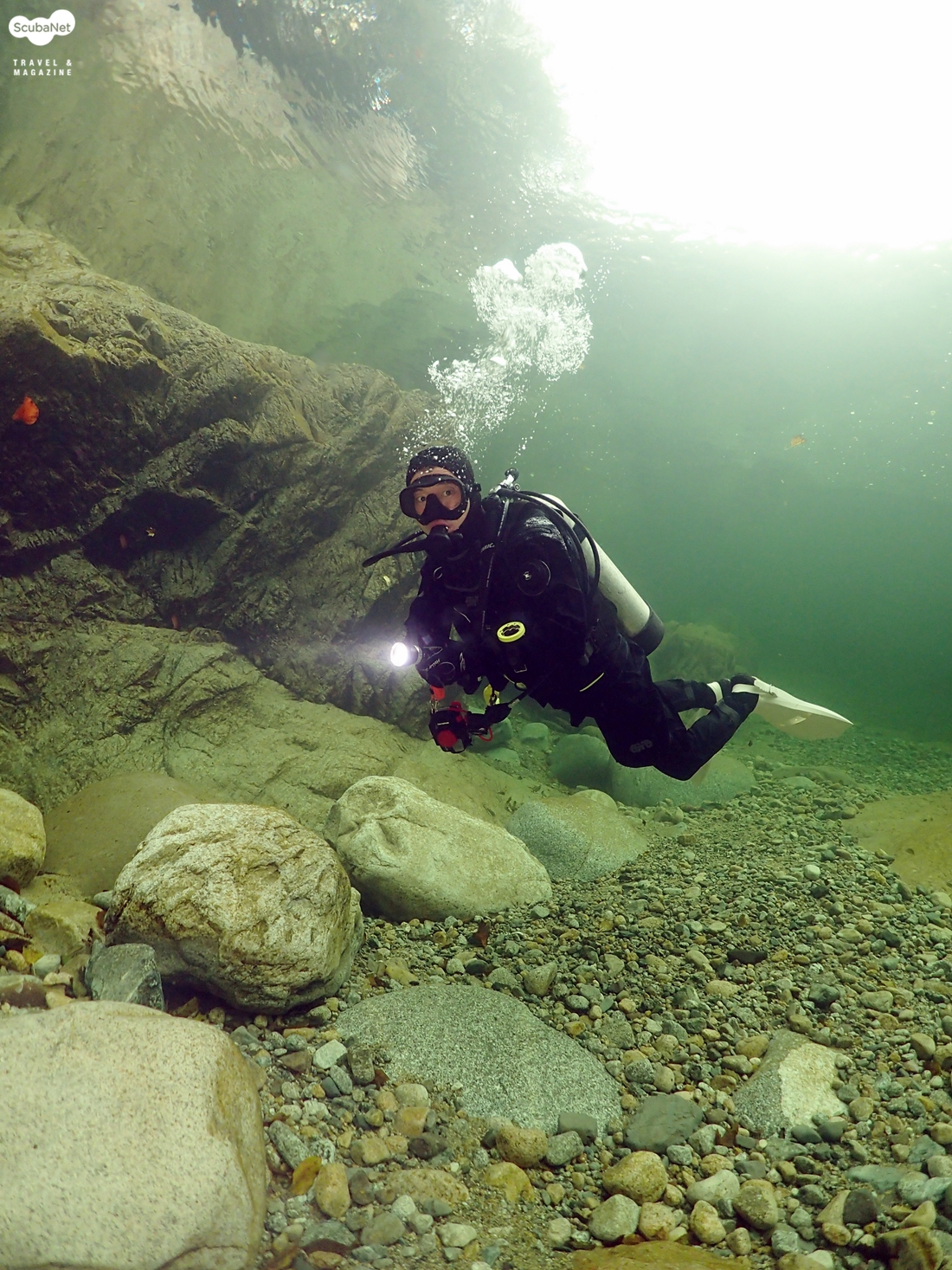 이날 수온은 약 13℃가 나왔다. 햇살이 비추면 물속의 모습이 더 아름답지 않을까 하는 생각이 들면서 아쉬운 다이빙을 이어 나갔다. 처음 들어간 일행들이 30분 정도를 하고 나왔다. 이제 내가 들어갈 차례다. 계곡의 물속은 어떤 모습으로 되어 있을까? 물고기는 얼마나 살고 있을까? 물속은 얼마나 깨끗할까? 유튜브에서 본 모습 그대로인가? 등등 많은 호기심을 갖고 다이빙을 시작 했다. 그리 크지는 않지만 30분이라는 시간을 즐기기에는 부족하지 않았다.