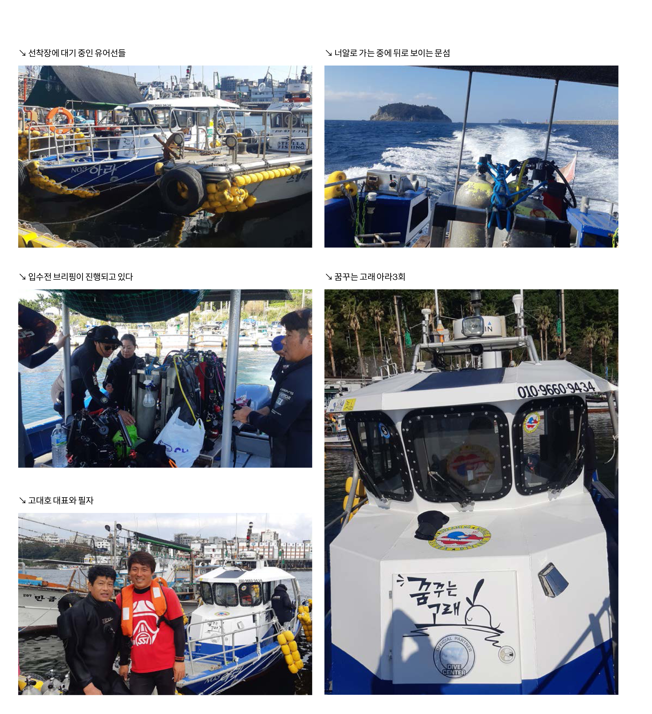 보트 다이빙을 나가기 전 서귀포 유어선선착장에서고대호 대표는 아라3호, 순연호, 스텔라호 등 3척의 다이빙전용선을 운영하고 있다. 그는 현재 서귀포바다영어조합법인 소속으로 수상수중레저사업부를 맡고 있다. 또한 서귀동 어촌계의 일원이기도 하다. 그래서 바다낚시는 물론이고 다이버들을 안내하는 서비스까지 제공하고 있는 것이다.