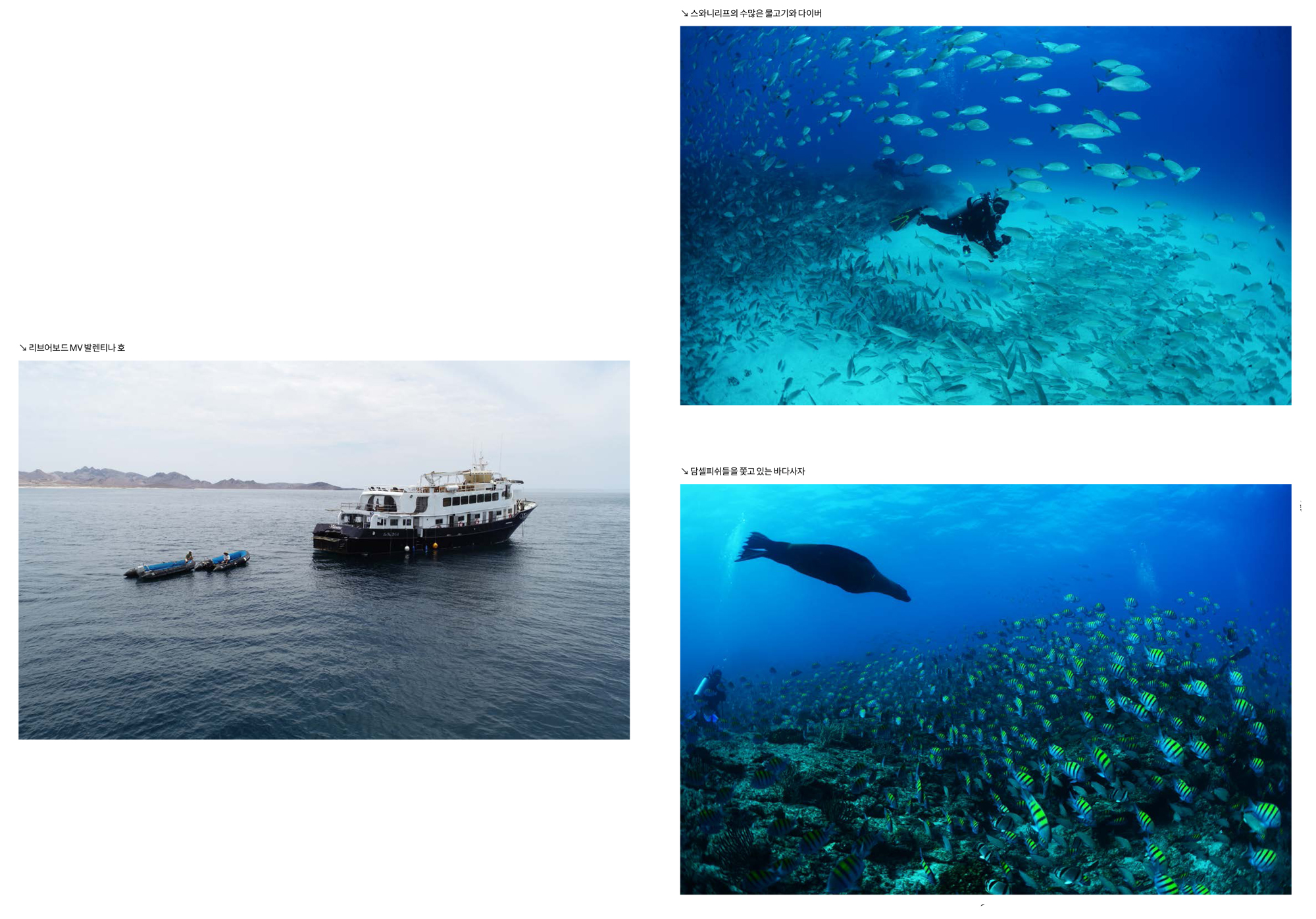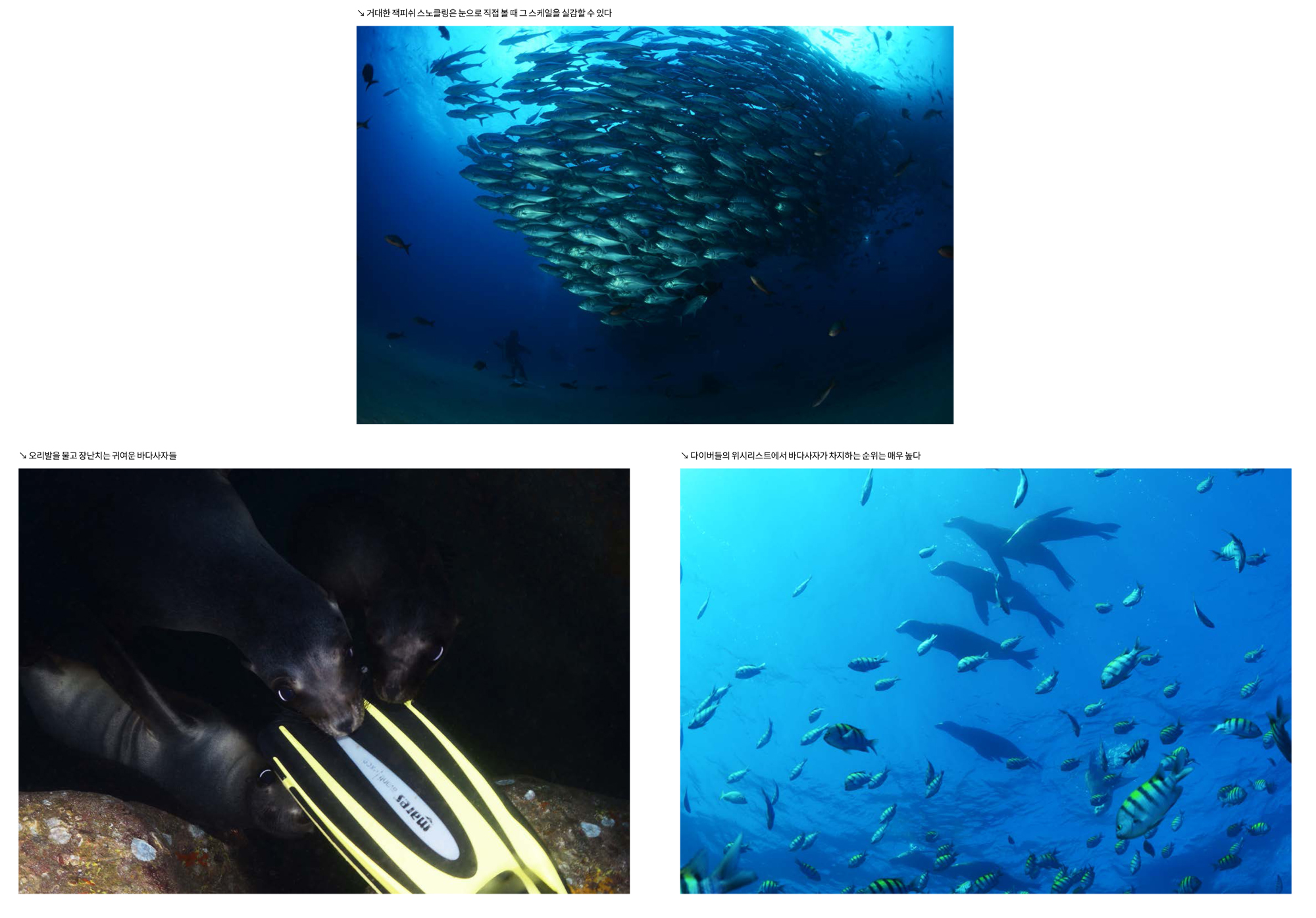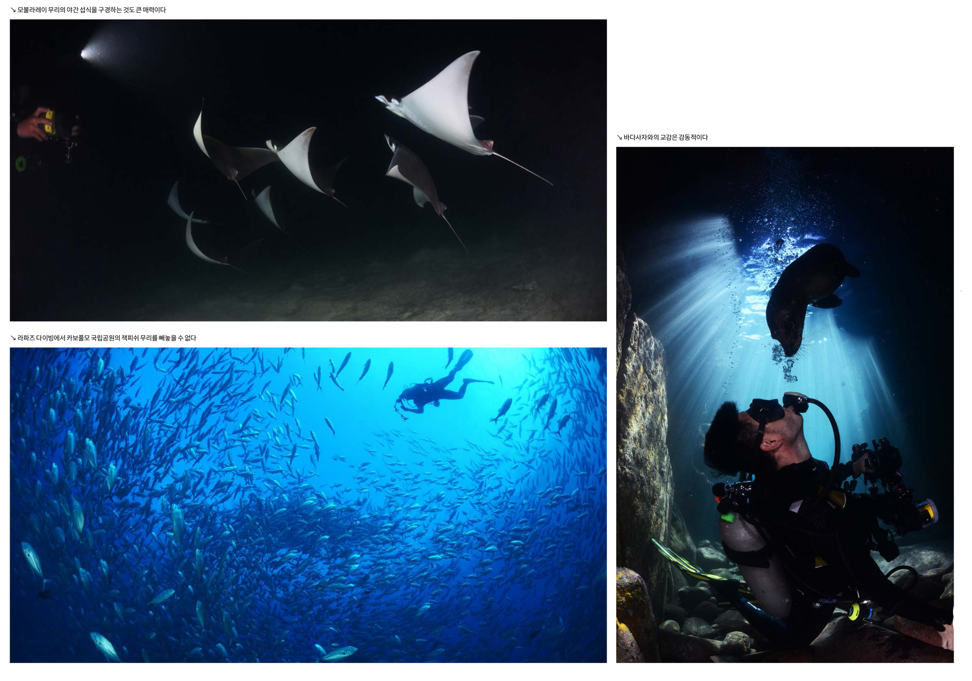 라파즈 다이빙에서 볼 수 있는 것들앞에서도 이야기했듯이 라파즈 다이빙에서는 바다사자, 모불라레이, 잭피쉬, 고래상어, 햄머헤드 등을 비롯해서 난파선, 각종 물고기 떼 등을 볼 수 있다. 이 중에서 바다사자와 모불라레이, 잭피쉬 등은 계절에 상관없이 언제 찾아가도 볼 수 있다. 다만 바다사자의 경우 보호기간 동안에 접근할 수 없는 지역이 있고, 태어난 월령에 따라서 다이버들과의 친밀도가 달라진다. 따라서 그런 차이점을 좀 알고서 가면 바다사자와 교감을 하는데 도움이 될 것이다.