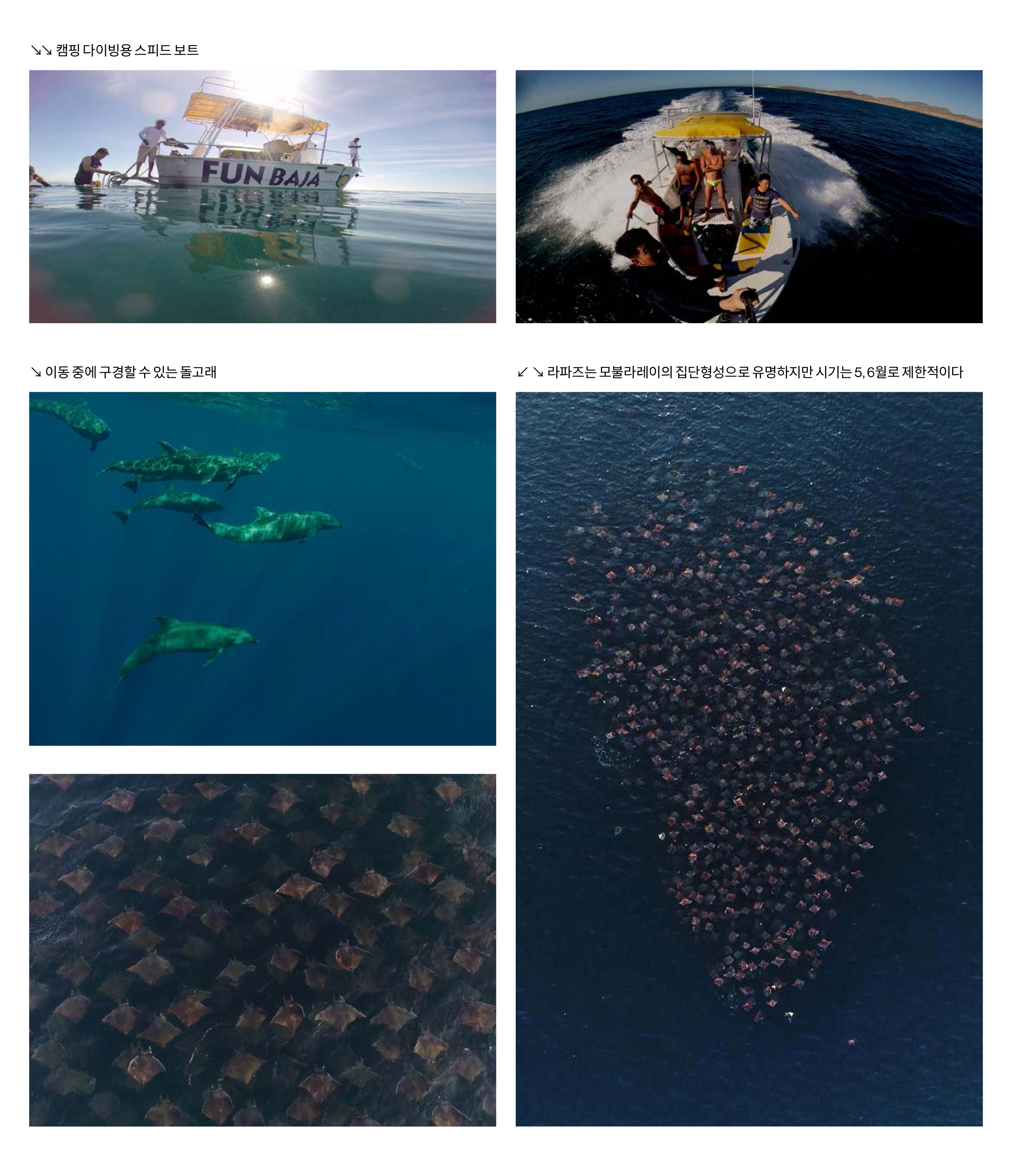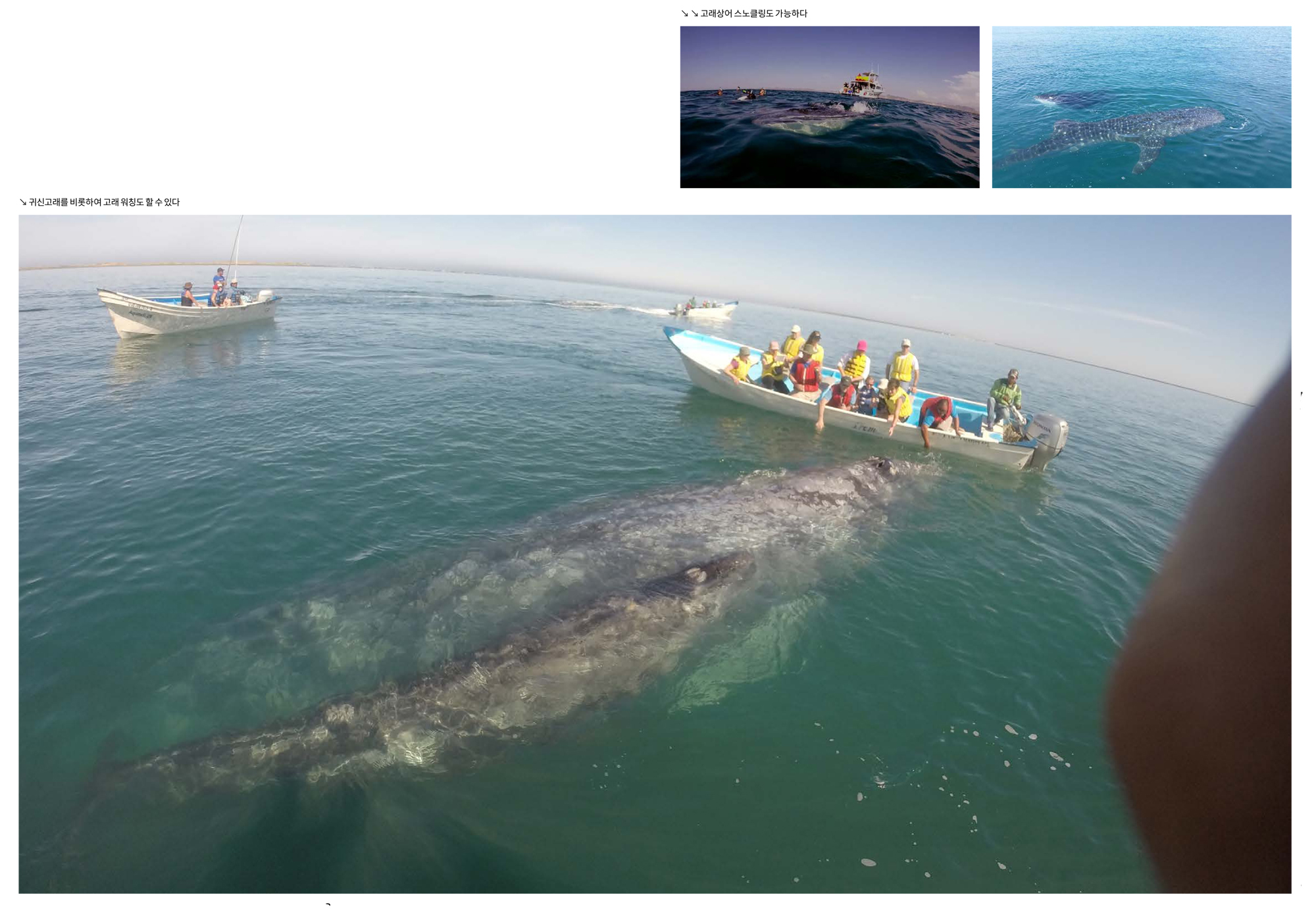 고래 워칭은 바하캘리포니아에서 연중 가능하다고 하지만 주로 겨울철이다. 귀신고래와 혹등고래는 12월~4월, 흰수염고래는 2월~3월에 바하캘리포니아 연안을 지난다. 라파즈에서 출항하는 경우도 있지만 귀신고래는 태평양 쪽의 막달레나 베이 Magdalena Bay로 가야한다. 카보산루카스 Cabo San Lucas에서 출발하는 트립도 있다. 마찬가지로 다이빙과 연계해서 진행하기는 어렵다. 다만 5~6월경에 모불라레이를 찾아가는 스노클링 트립을 할 때 고래를 볼 기회가 생기기도 한다.
