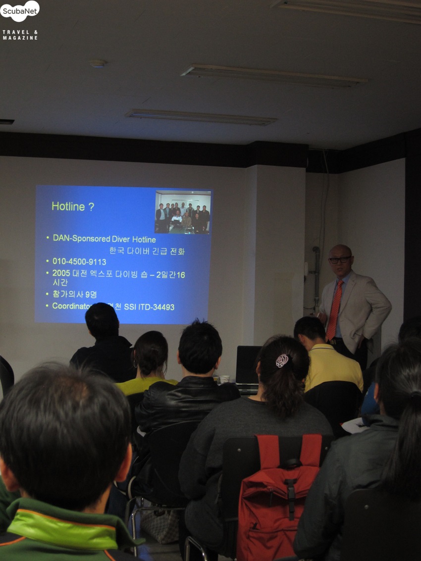4월의 마지막 주 금요일, 다이버들이 모여 “불금”을 보내고 있는 현장을 찾았다. 다이버스몰에서 주최한 잠수의학 세미나는 안전한 다이빙에 대해 배우고 싶어 하는 다이버들의 열기로 뜨거웠다. 평일 저녁 7시, 다소 외곽인 다이버스몰의 위치에도 불구하고 세미나가 시작하기 전에 준비된 자리는 거의 만원이었고, 중간 중간에 의자가 추가로 배치됐다. 다른 세미나 때보다 참가인원을 넉넉히 잡았는데도 오히려 인원이 빨리 마감됐다며 다이버스몰에서도 다이버들의 뜨거운 관심에 놀라는 눈치였다. 세미나는 이비인후과 전문의이며 DAN 트레이너, SSI 트레이닝 디렉터인 강영천 박사님이 직접 진행하였다. 세미나 내용은 크게 다섯 부분으로 나눌 수 있었다. 먼저 “DAN 후원 한국 다이버 긴급 전화”에 대해 소개하고, 실제로 이 핫라인이 어떻게 운영되고 어떤 사례가 있는지 설명하였다. 강영천 박사님은 DAN 후원 한국 다이버 긴급 전화를 직접 코디네이트 하고 있는데 다이빙에 관련된 모든 질문을 받는다고 한다. 다이빙 후 신체에 이상이 느껴지는데 도움을 요청할 곳이 없는 경우, 연락을 취하면 전문적인 도움을 받을 수 있다(연락처: 010-4500-9113). 2005년부터 2011년까지 총 738건의 핫라인 콜이 있었고, 2009년 이후 횟수가 크게 늘어 2010년과 2011년에는 각기 200건 이상이 발생했다고 한다. 이어서 감압질환(DCI;decompression illness)에 대해 설명하였다. DAN에 따르면 감압질환은 주변압이 감소하면서 나타나는 질환을 말하며, 이는 다시 동맥공기색전증(AGE; arterial gas embolism, 다이빙 후 생기는 일종의 중풍)과 감압병(DCI; decompression sickness, AGE 이외의 모든 다이빙 관련 질환)으로 구분된다. 감압병은 조직 내에서 커지는 질소 기포에 의해 발생하는 것으로 지엽적인 손상을 초래하며, 동맥공기색전증은 폐에서 팽창된 공기가 폐포를 파괴하고 동맥(주로 뇌동맥)으로 흘러들어가면서 모세혈관의 혈액 흐름을 막아 조직(주로 중추신경)의 손상을 일으키는 것으로 발생하는 기전이 다르다. 이러한 감압질환을 측정할 수 있는 방법은 없고 오로지 징후와 증상으로만 판단할 수 있는데 무딘 감각, 저림, 어지러움, 의식소실, 마비, 성격변화, 균형감 상실, 조율 부재(이상 중추신경 관련 증상), 통증, 두통, 극도의 피로감, 허약감, 병약감, 가려움, 발진, 기침, 등 다양한 징후와 증상이 나타난다. 감압질환의 증상은 90%가 한 시간 이내에 발생하고 24시간 이후에 발생하는 증상은 다른 원인에 의한 것일 가능성이 높다고 한다. 중추신경 관련 증상이 있을 경우 반드시 챔버 치료를 받는 것이 바람직하다. 감압질환을 위한 응급처치로는 먼저 조난자를 회복 자세로 편안히 눕히고 100% 산소를 가급적 빨리 끊임없이 공급하는 것이 중요하다. 강박사님은 ‘레크리에이션은 안전하고 테크니컬은 안전하지 않다, 주간 다이빙은 안전하고 야간 다이빙은 안전하지 않다, 어드밴스드 이상은 안전하고 오픈워터는 안전하지 않다’ 등 안전한 다이빙에 대한 여러 오해가 있지만 결론은 정확한 교육과 확실한 이해에 기초한 계속적인 반복 훈련만이 안전을 보장한다고 말했다. 다이빙 계의 새로운 이슈 중 가장 흥미로웠던 건 먼저 하강/상승에 대한 내용이 있었다. 수직으로 하강을 할 경우 머리끝과 발끝 간에 본인의 키만큼 압력 차이가 생기게 되므로 머리끝에서 발끝까지 동일한 압력을 받을 수 있도록 수평자세로 하강하는 것이 바람직하다고 한다. 상승속도에 대해서는 PADI는 분당 18m, 다른 다이빙 교육 단체들은 분당 9m로 규정하지만 비율감압(ratio deco)이라는 새로운 방법도 소개했다. 최대 수심 압력의 1/2 압력이 되는 수심까지는 규정 속도대로 상승하고 그 이후는 분당 3m의 속도로 보다 천천히 상승하라는 것이었다.